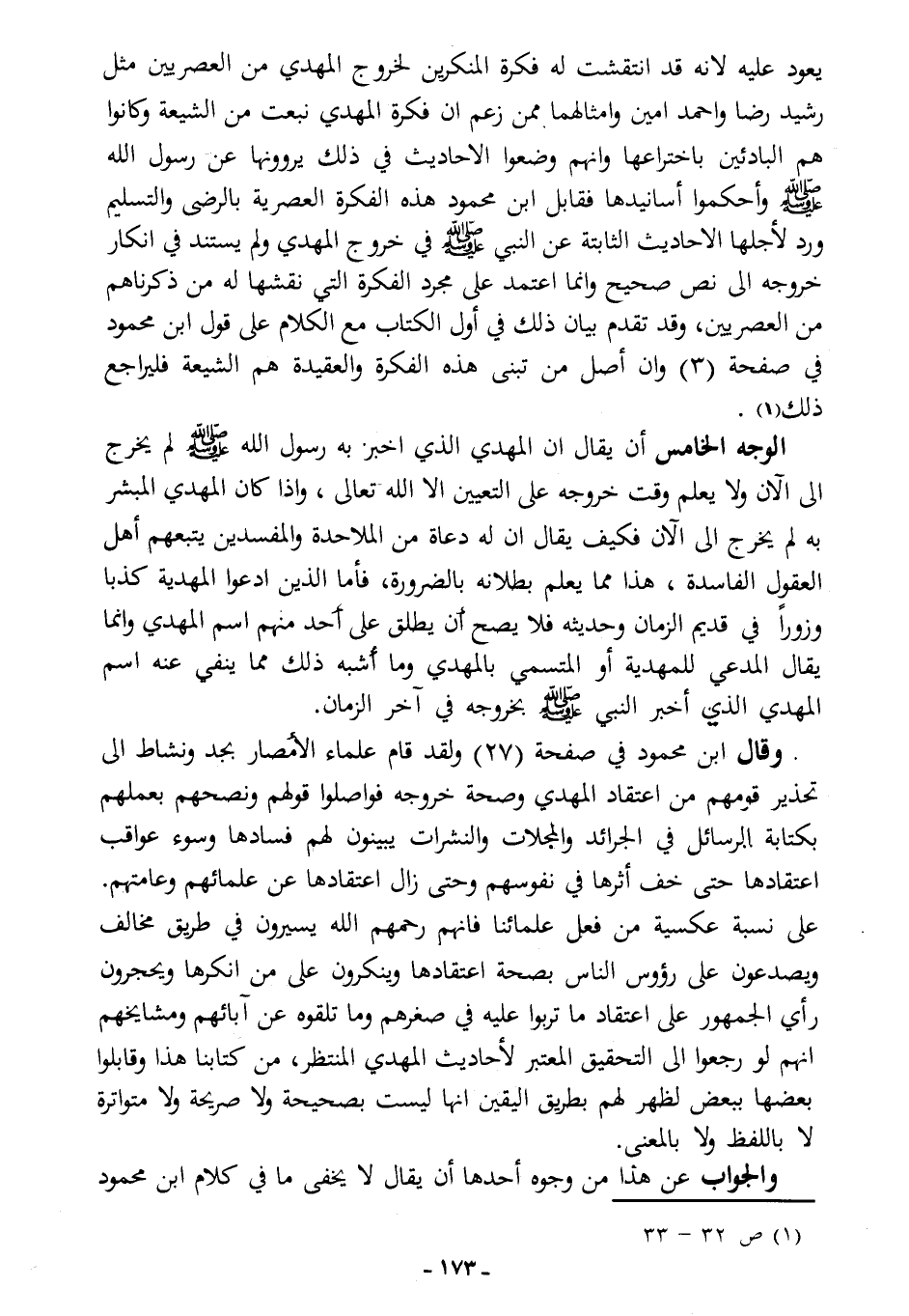 وقال ابن محمود في صفحة (27): "ولقد قام علماء الأمصار بجد ونشاط إلى تحذير قومهم من اعتقاد المهدي وصحة خروجه، فواصلوا قولهم ونصحهم، بعملهم بكتابة الرسائل في الجرائد والمجلات والنشرات، يبينون لهم فسادها وسوء عواقب اعتقادها، حتى خفَّ أثرها في نفوسهم، وحتى زال اعتقادها عن علمائهم وعامتهم، على نسبة عكسية من فعل علمائنا، فإنهم -رحمهم الله- يسيرون في طريق مخالف، ويصدعون على رؤوس الناس بصحة اعتقادها، وينكرون على من أنكرها، ويحجرون رأي الجمهور على اعتقاد ما تربوا عليه في صغرهم، وما تلقوه عن آبائهم ومشايخهم، إنهم لو رجعوا إلى التحقيق المعتبر لأحاديث المهدي المنتظر من كتابنا هذا وقابلوا بعضها ببعض، لظهر لهم بطريق اليقين أنها ليست بصحيحة ولا صريحة ولا متواترة، لا باللفظ ولا بالمعنى".