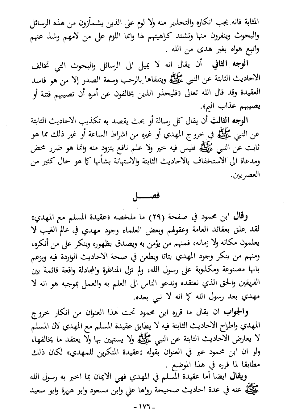 والجواب: أن يقال: ما قرره ابن محمود تحت هذا العنوان من إنكار خروج المهدي وإطراح الأحاديث الثابتة فيه لا يطابق عقيدة المسلم مع المهدي؛ لأن المسلم لا يعارض الأحاديث الثابتة عن النبي - صلى الله عليه وسلم -، ولا يستهين بها، ولا يعتقد ما يخالفها، ولو أن ابن محمود عبَّر في العنوان بقوله: "عقيدة المنكرين للمهدي" لكان ذلك مطابقًا لما قرره في هذا الموضع.