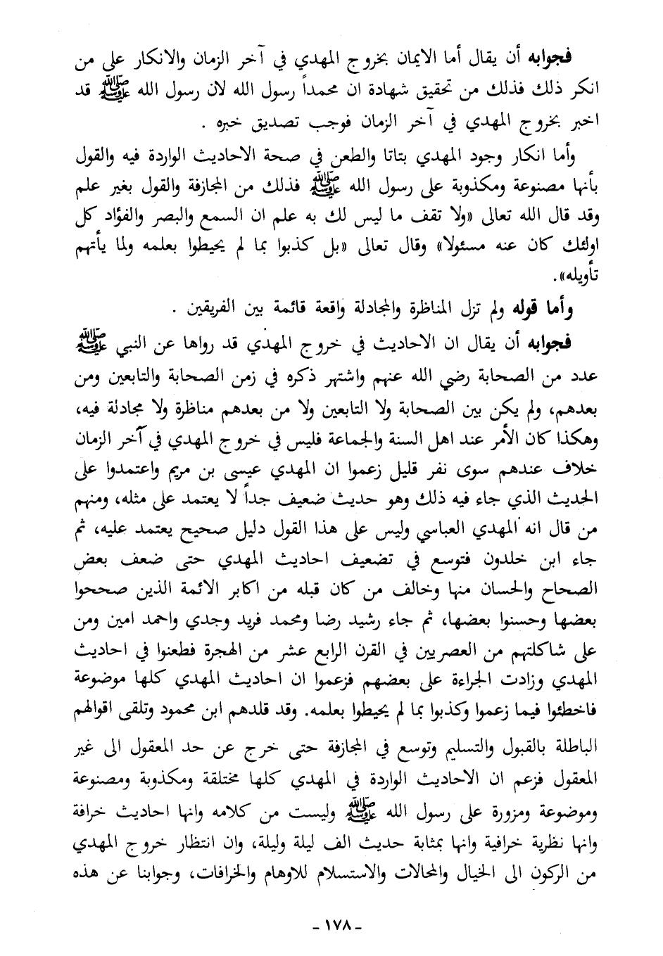 فجوابه: أن يقال: إن الأحاديث في خروج المهدي قد رواها عن النبي - صلى الله عليه وسلم - عدد من الصحابة -رضي الله عنهم-، واشتهر ذكره في زمن الصحابة والتابعين ومن بعدهم، ولم يكن بين الصحابة ولا التابعين ولا من بعدهم مناظرة ولا مجادلة فيه، وهكذا كان الأمر عند أهل السنة والجماعة، فليس في خروج المهدي في آخر الزمان خلاف عندهم، سوى نفر قليل زعموا أن المهدي عيسى ابن مريم، واعتمدوا على الحديث الذي جاء فيه ذلك، وهو حديث ضعيف جدًا لا يعتمد على مثله، ومنهم من قال إنه المهدي العباسي، وليس على هذا القول دليل صحيح يعتمد عليه. ثم جاء ابن خلدون فتوسع في تضعيف أحاديث المهدي، حتى ضعف بعض الصحاح والحسان منها، وخالف من كان قبله من أكابر الأئمة، الذين صححوا بعضها وحسنوا بعضها. ثم جاء رشيد رضا، ومحمد فريد وجدي، وأحمد أمين، ومن على شاكلتهم من العصريين في القرن الرابع عشر من الهجرة، فطعنوا في أحاديث المهدي، وزادت الجراءة على بعضهم فزعموا أن أحاديث المهدي كلها موضوعة، فأخطئوا فيما زعموا وكذبوا بما لم يحيطوا بعلمه. وقد قلدهم ابن محمود وتلقى أقوالهم الباطلة بالقبول والتسليم، وتوسع في المجازفة حتى خرج عن حد المعقول إلى غير المعقول، فزعم أن الأحاديث الواردة في المهدي كلها مختلقة ومكذوبة ومصنوعة وموضوعة ومزورة على رسول الله - صلى الله عليه وسلم - وليست من كلامه، وأنها أحاديث خرافة، وأنها نظرية خرافية، وأنها بمثابة حديث ألف ليلة وليلة، وأن انتظار خروج المهدي من الركون إلى الخيال والمحالات، والاستسلام للأوهام والخرافات. وجوابنا عن هذه ..................................