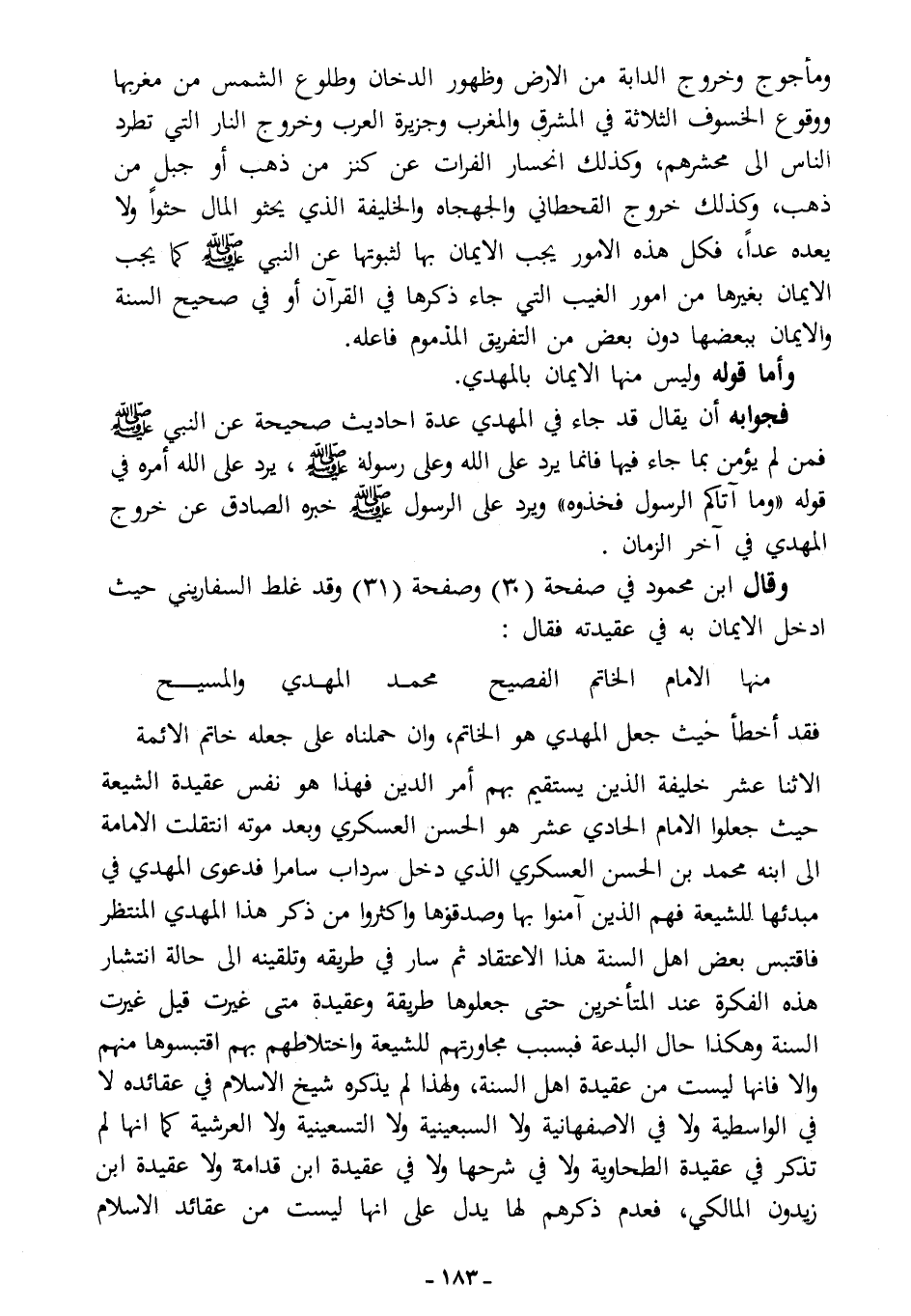 فقد أخطأ حيث جعل المهدي هو الخاتم، وإن حملناه على جعله خاتم الأئمة الاثنا عشر خليفة الذين يستقيم بهم أمر الدين، فهذا هو نفس عقيدة الشيعة حيث؛ جعلوا الإمام الحادي عشر هو الحسن العسكري، وبعد موته انتقلت الإمامة إلى ابنه محمد بن الحسن العسكري الذي دخل سرداب سامراء، فدعوى المهدي في مبدئها للشيعة، فهم الذين آمنوا بها وصدقوها وأكثروا من ذكر هذا المهدي المنتظر، فاقتبس بعض أهل السنة هذا الاعتقاد، ثم سار في طريقه وتلقينه إلى حالة انتشار هذه الفكرة عند المتأخرين، حتى جعلوها طريقة وعقيدة متى غيرت قيل غيرت السنة، وهكذا حال البدعة، فبسبب مجاورتهم للشيعة واختلاطهم بهم اقتبسوها منهم، وإلا فإنها ليست من عقيدة أهل السنة، ولهذا لم يذكره شيخ الإسلام في عقائده؛ لا في الواسطية، ولا في الأصفهانية، ولا السبعينية، ولا التسعينية، ولا العرشية، كما أنها لم تذكر في عقيدة الطحاوية، ولا في شرحها، ولا في عقيدة ابن قدامة، ولا عقيدة ابن زيدون المالكي. فعدم ذكرهم لها يدل على أنها ليست من عقائد الإسلام