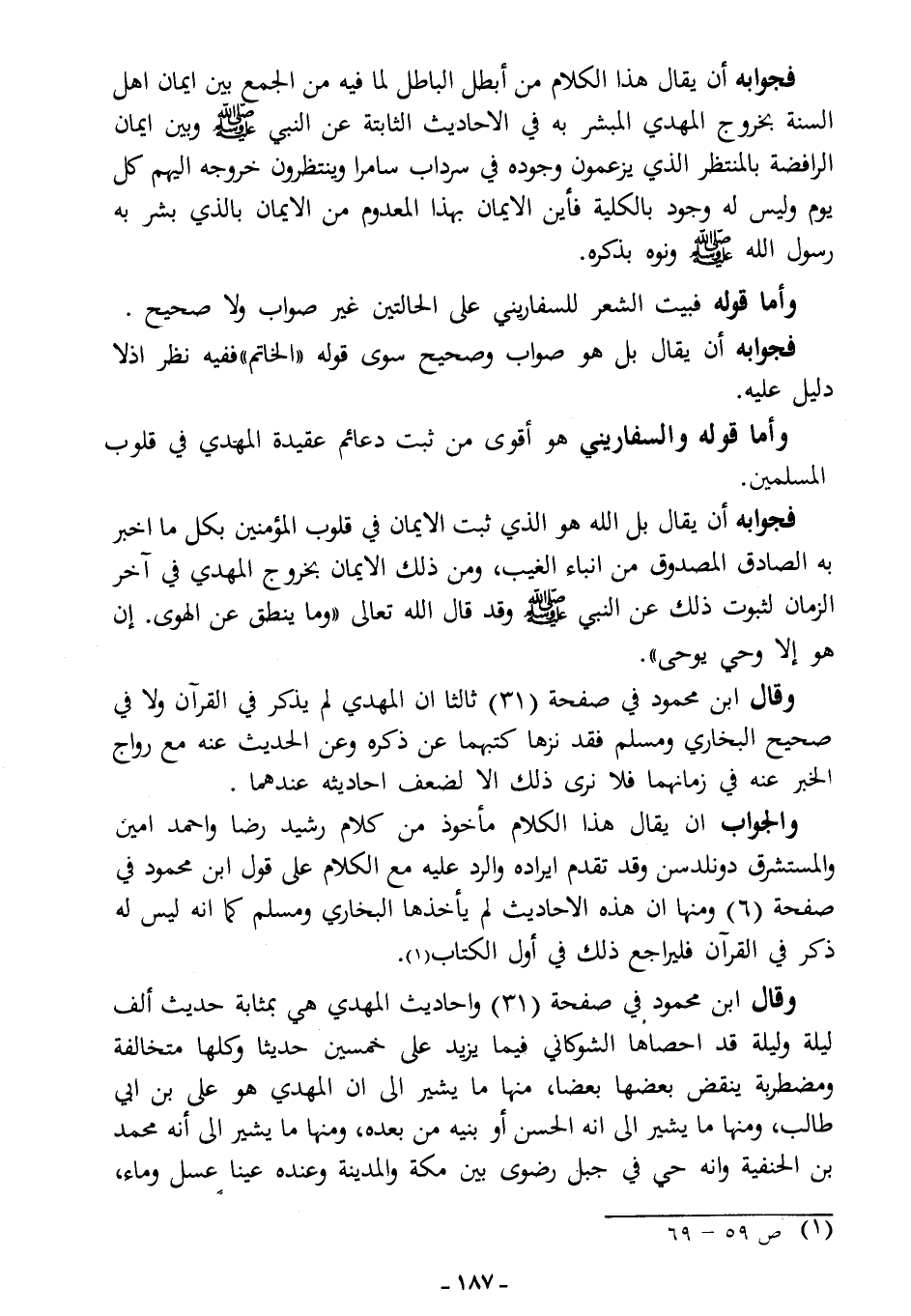 وقال ابن محمود في صفحة (31): "وأحاديث المهدي هي بمثابة حديث ألف ليلة وليلة، قد أحصاها الشوكاني فيما يزيد على خمسين حديثًا، وكلها متخالفة ومضطربة، ينقض بعضها بعضًا، منها ما يشير إلى أن المهدي هو علي بن أبي طالب، ومنها ما يشير إلى أنه الحسن أو بنيه من بعده، ومنها ما يشير إلى أنه محمد بن الحنفية، وأنه حي في جبل رضوى بين مكة والمدينة وعنده عينا عسل وماء، ............................................