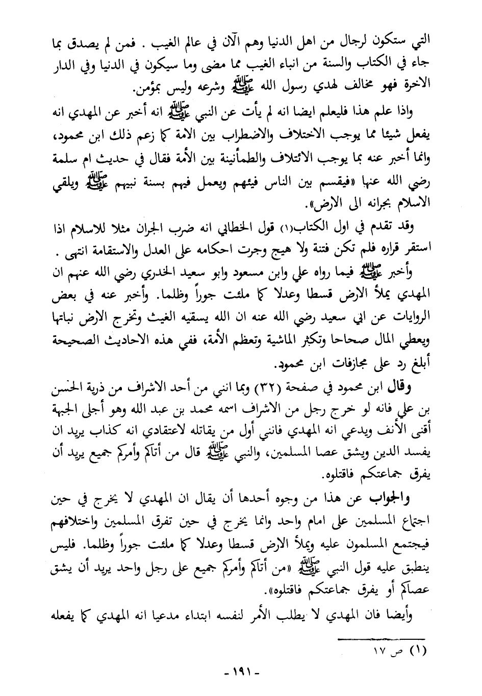 وقال ابن محمود في صفحة (32): "وبما أنني من أحد الأشراف من ذرية الحسن بن علي، فإنه لو خرج رجل من الأشراف اسمه محمد بن عبد الله وهو أجلى الجبهة أقنى الأنف ويدعي أنه المهدي فإنني أول من يقاتله؛ لاعتقادي أنه كذاب يريد أن يفسد الدين ويشق عصا المسلمين، والنبي - صلى الله عليه وسلم - قال: «من أتاكم وأمركم جميع يريد أن يفرق جماعتكم فاقتلوه» ".