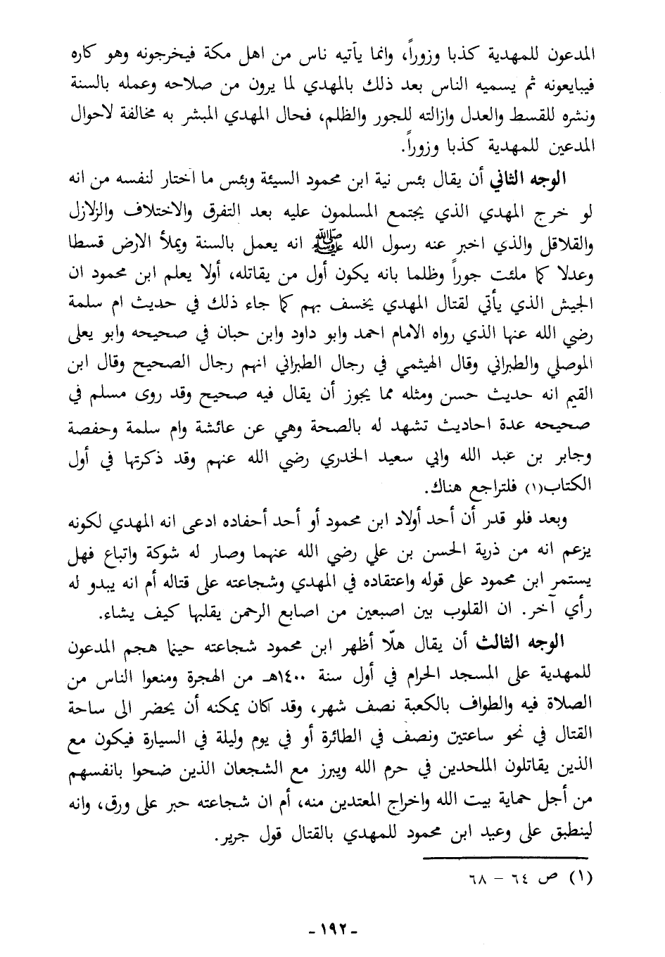 الوجه الثالث: أن يقال: هلا أظهر ابن محمود شجاعته حينما هجم المدعون للمهدية على المسجد الحرام في أول سنة 1400هـ من الهجرة، ومنعوا الناس من الصلاة فيه والطواف بالكعبة نصف شهر! وقد كان يمكنه أن يحضر إلى ساحة القتال في نحو ساعتين ونصف في الطائرة، أو في يوم وليلة في السيارة، فيكون مع الذين يقاتلون الملحدين في حرم الله، ويبرز مع الشجعان الذين ضحوا بأنفسهم من أجل حماية بيت الله وإخراج المعتدين منه، أم أن شجاعته حبر على ورق؟! وإنه لينطبق على وعيد ابن محمود للمهدي بالقتال قول جرير: