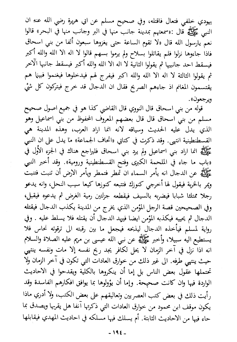 إلى غير ذلك من خوارق العادات التي تكون في آخر الزمان ولا تحتملها عقول بعض الناس، بل إما أن ينكروها بالكلية ويقدحوا في الأحاديث الواردة فيها وإن كانت صحيحة، وإما أن يؤولوها بما يوافق أفكارهم الفاسدة، وقد رأيت ذلك في بعض كتب العصريين وتعاليقهم على بعض الكتب، ولا أدري ماذا يكون موقف ابن محمود من خوارق العادات التي ذكرتها آنفًا، هل يُقِرُّ بها ويُصدِّق بما جاء فيها من الأحاديث الثابتة، أم يسلك فيها مسلكه في أحاديث المهدي، فيقابلها .......................................