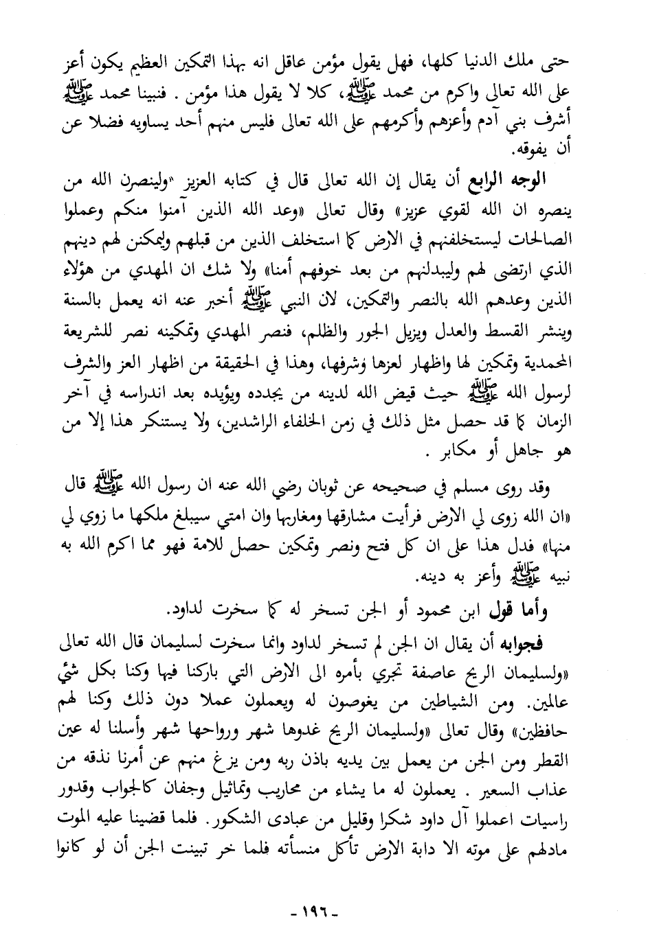 الوجه الرابع: أن يقال: إن الله -تعالى- قال في كتابه العزيز: {وَلَيَنْصُرَنَّ اللَّهُ مَنْ يَنْصُرُهُ إِنَّ اللَّهَ لَقَوِيٌّ عَزِيزٌ}، وقال -تعالى-: {وَعَدَ اللَّهُ الَّذِينَ آَمَنُوا مِنْكُمْ وَعَمِلُوا الصَّالِحَاتِ لَيَسْتَخْلِفَنَّهُمْ فِي الْأَرْضِ كَمَا اسْتَخْلَفَ الَّذِينَ مِنْ قَبْلِهِمْ وَلَيُمَكِّنَنَّ لَهُمْ دِينَهُمُ الَّذِي ارْتَضَى لَهُمْ وَلَيُبَدِّلَنَّهُمْ مِنْ بَعْدِ خَوْفِهِمْ أَمْنًا}. ولا شك أن المهدي من هؤلاء الذين وعدهم الله بالنصر والتمكين؛ لأن النبي - صلى الله عليه وسلم - أخبر عنه أنه يعمل بالسنة وينشر القسط والعدل ويزيل الجور والظلم، فنصر المهدي وتمكينه نصر للشريعة المحمدية وتمكين لها وإظهار لعزها وشرفها، وهذا في الحقيقة من إظهار العز والشرف لرسول الله - صلى الله عليه وسلم -، حيث قيَّض الله لدينه من يجدده ويؤيده بعد اندراسه في آخر الزمان، كما قد حصل مثل ذلك في زمن الخلفاء الراشدين، ولا يستنكر هذا إلا من هو جاهل أو مكابر.