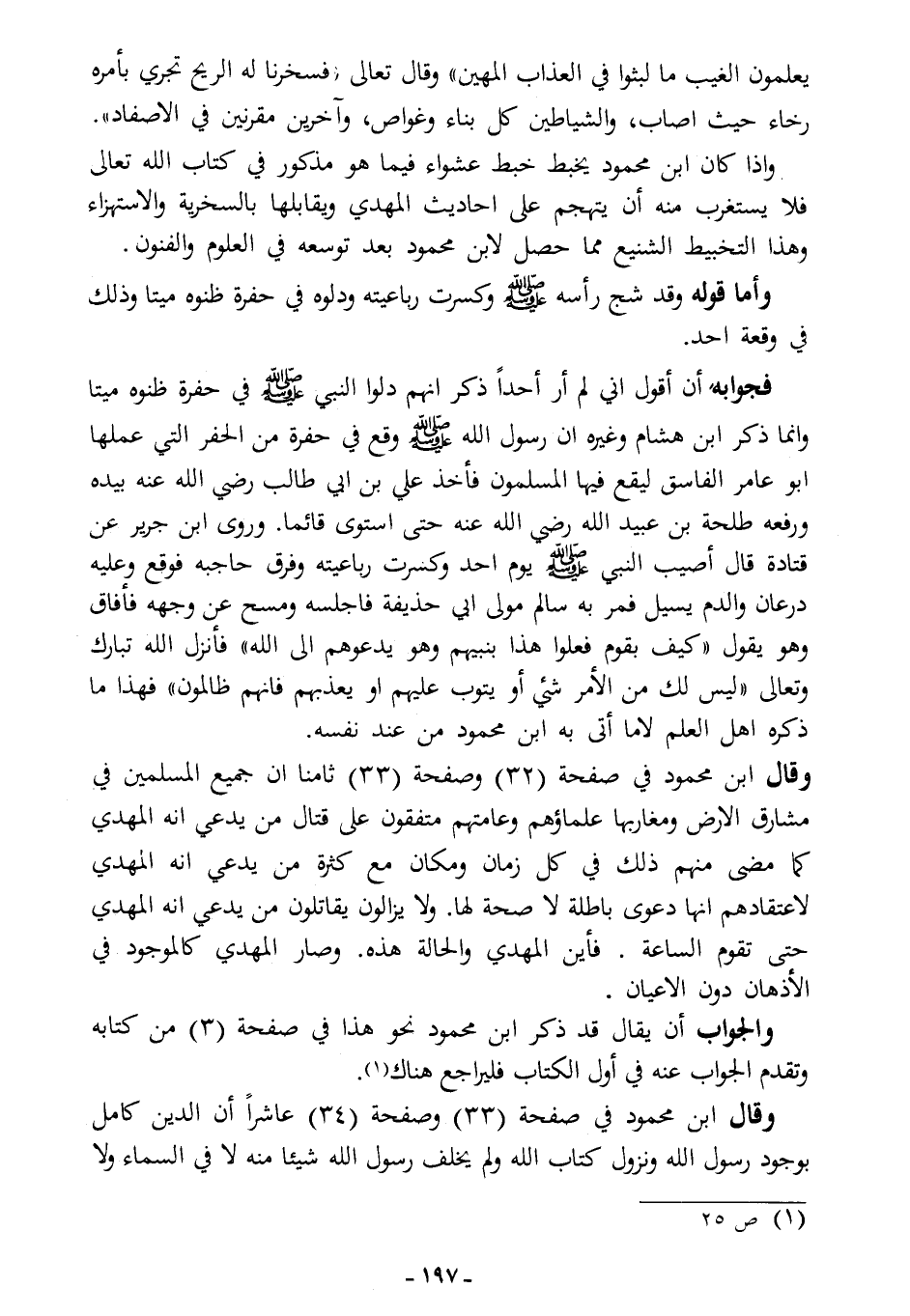 وقال ابن محمود في صفحة (32) وصفحة (33): "ثامنًا: إن جميع المسلمين في مشارق الأرض ومغاربها علماؤهم وعامتهم متفقون على قتال من يدعي أنه المهدي، كما مضى منهم ذلك في كل زمان ومكان مع كثرة من يدعي أنه المهدي؛ لاعتقادهم أنها دعوى باطلة لا صحة لها، ولا يزالون يقاتلون من يدَّعي أنه المهدي حتى تقوم الساعة، فأين المهدي والحالة هذه؟ وصار المهدي كالموجود في الأذهان دون الأعيان".