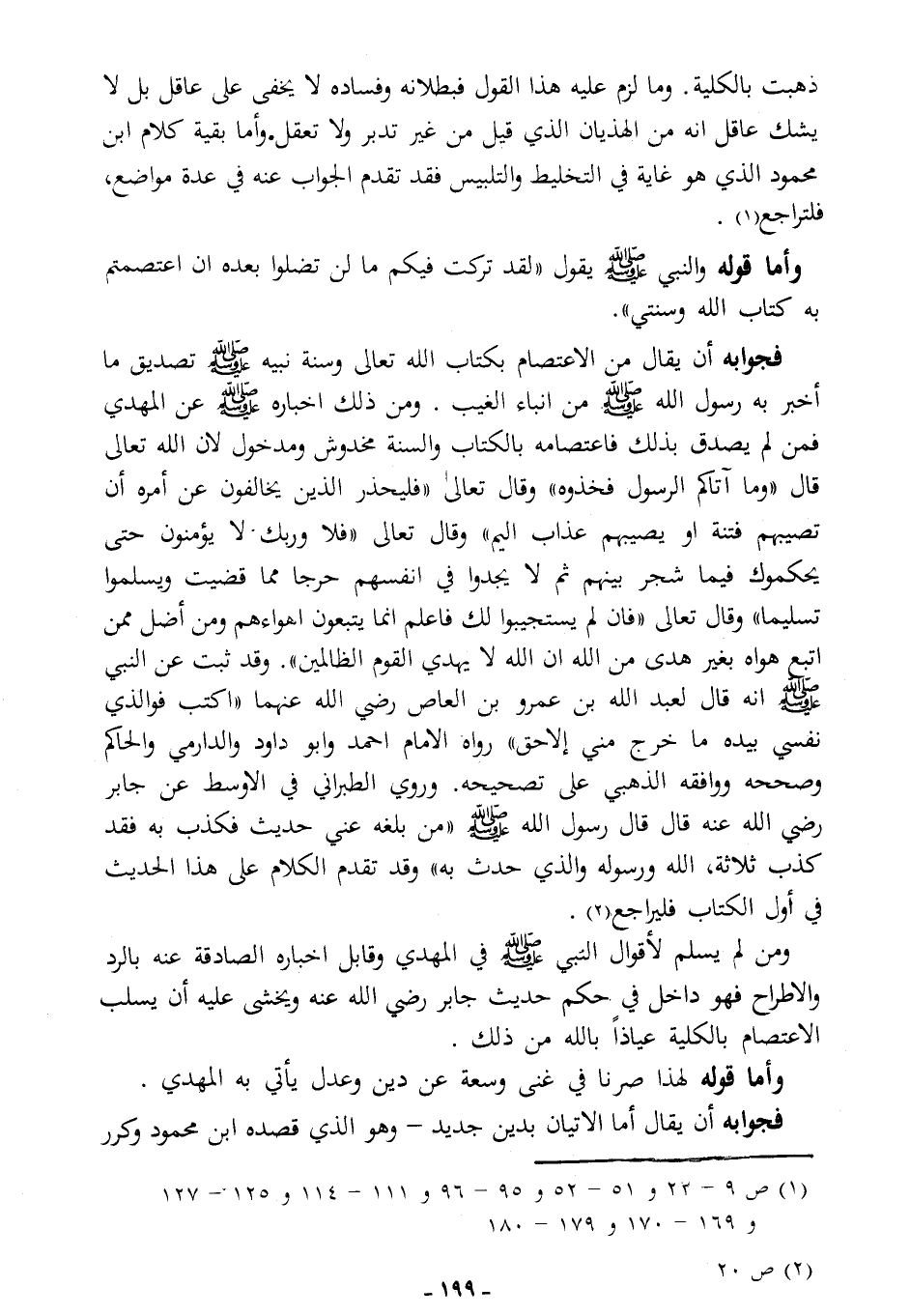 فجوابه: أن يقال: من الاعتصام بكتاب الله -تعالى- وسنة نبيه - صلى الله عليه وسلم - تصديق ما أخبر به رسول الله - صلى الله عليه وسلم - من أنباء الغيب، ومن ذلك إخباره - صلى الله عليه وسلم - عن المهدي، فمن لم يصدق بذلك فاعتصامه بالكتاب والسنة مخدوش ومدخول؛ لأن الله -تعالى- قال: {وَمَا آَتَاكُمُ الرَّسُولُ فَخُذُوهُ}، وقال -تعالى-: {فَلْيَحْذَرِ الَّذِينَ يُخَالِفُونَ عَنْ أَمْرِهِ أَنْ تُصِيبَهُمْ فِتْنَةٌ أَوْ يُصِيبَهُمْ عَذَابٌ أَلِيمٌ}، وقال -تعالى-: {فَلَا وَرَبِّكَ لَا يُؤْمِنُونَ حَتَّى يُحَكِّمُوكَ فِيمَا شَجَرَ بَيْنَهُمْ ثُمَّ لَا يَجِدُوا فِي أَنْفُسِهِمْ حَرَجًا مِمَّا قَضَيْتَ وَيُسَلِّمُوا تَسْلِيمًا *}، وقال -تعالى-: {فَإِنْ لَمْ يَسْتَجِيبُوا لَكَ فَاعْلَمْ أَنَّمَا يَتَّبِعُونَ أَهْوَاءَهُمْ وَمَنْ أَضَلُّ مِمَّنَ اتَّبَعَ هَوَاهُ بِغَيْرِ هُدًى مِنَ اللَّهِ إِنَّ اللَّهَ لَا يَهْدِي الْقَوْمَ الظَّالِمِينَ}، وقد ثبت عن النبي - صلى الله عليه وسلم - أنه قال لعبد الله بن عمرو بن العاص -رضي الله عنهما-: «اكتب، فوالذي نفسي بيده ما خرج مني إلا حق». رواه الإمام أحمد، وأبو داود، والدارمي، والحاكم وصححه، ووافقه الذهبي على تصحيحه، وروي الطبراني في الأوسط عن جابر -رضي الله عنه- قال: قال رسول الله - صلى الله عليه وسلم -: «من بلغه عني حديث فكذب به فقد كذب ثلاثة؛ الله، ورسوله، والذي حدث به». وقد تقدم الكلام على هذا الحديث في أول الكتاب، فليراجع (¬2).