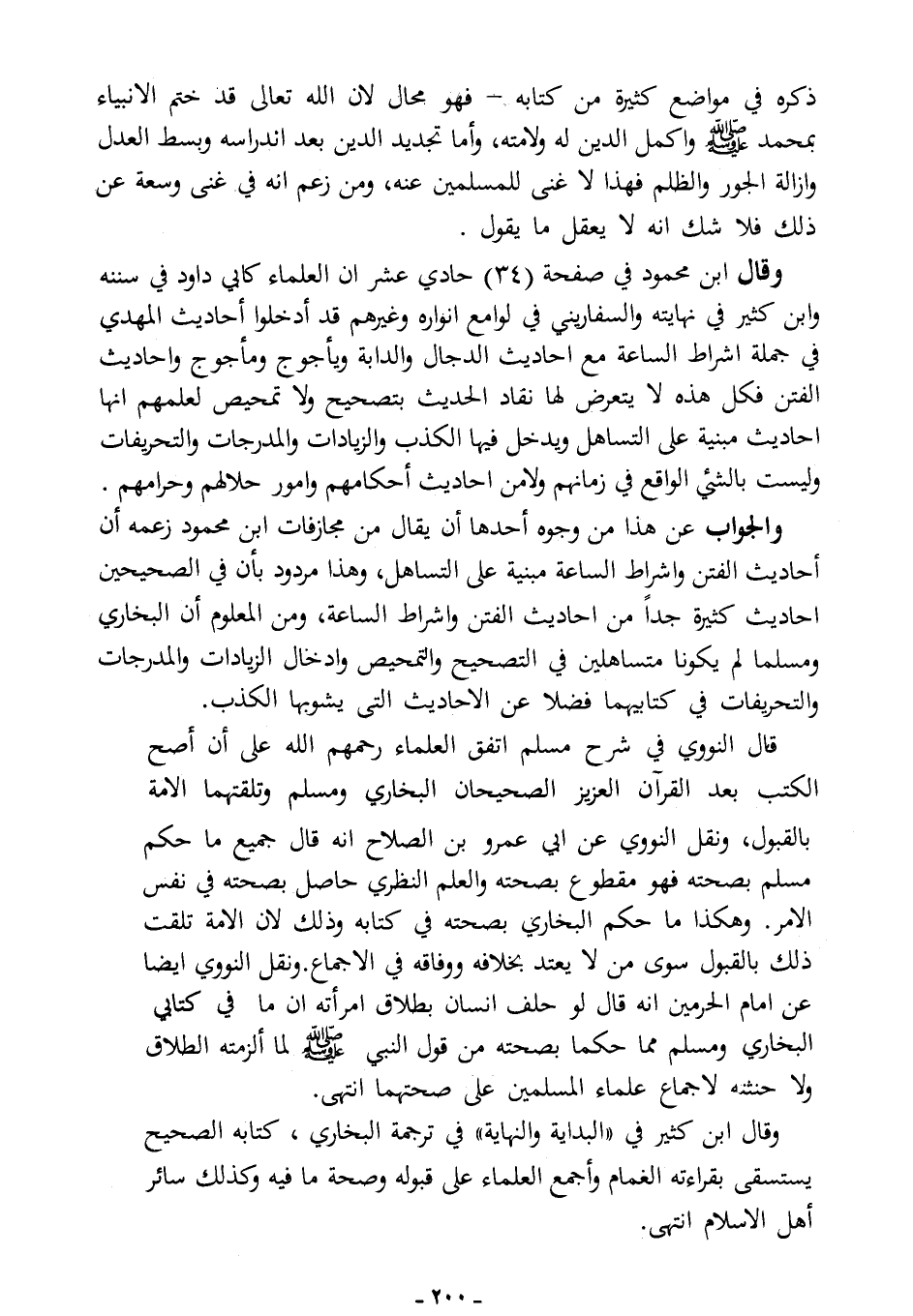 والجواب عن هذا من وجوه؛ أحدها: أن يقال: من مجازفات ابن محمود زعمه أن أحاديث الفتن وأشراط الساعة مبنية على التساهل، وهذا مردود بأن في الصحيحين أحاديث كثيرة جدًا من أحاديث الفتن وأشراط الساعة، ومن المعلوم أن البخاري ومسلمًا لم يكونا متساهلين في التصحيح والتمحيص وإدخال الزيادات والمدرجات والتحريفات في كتابيهما، فضلا عن الأحاديث التي يشوبها الكذب.