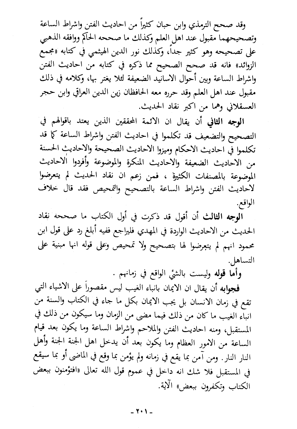 الوجه الثالث: أن أقول: قد ذكرت في أول الكتاب ما صححه نقاد الحديث من الأحاديث الواردة في المهدي فليراجع، ففيه أبلغ رد على قول ابن محمود إنهم لم يتعرضوا لها بتصحيح ولا تمحيص، وعلى قوله إنها مبنية على التساهل.