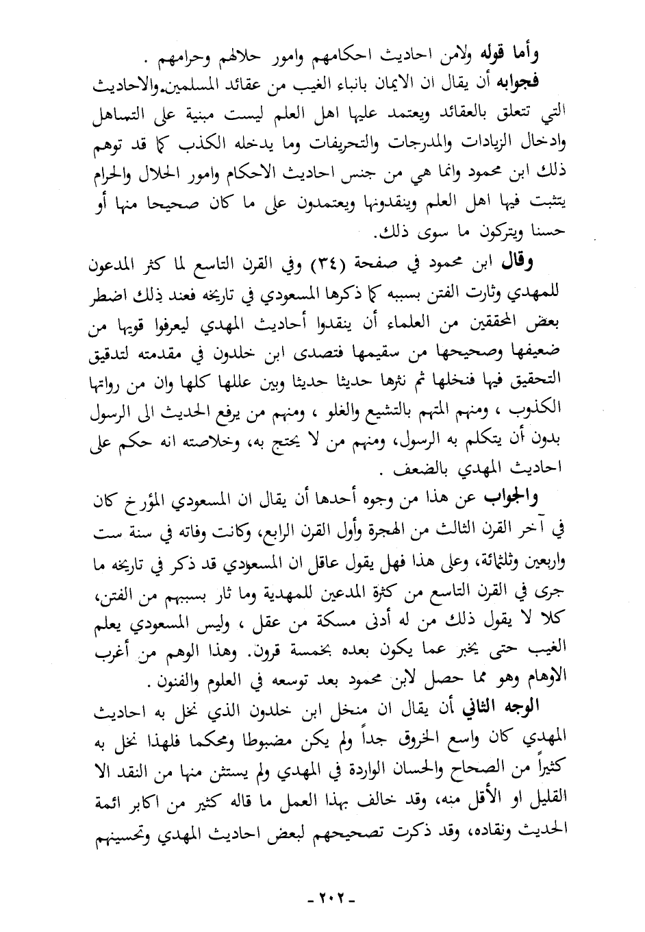 والجواب عن هذا من وجوه؛ أحدها: أن يقال: إن المسعودي المؤرخ كان في آخر القرن الثالث من الهجرة وأول القرن الرابع، وكانت وفاته في سنة ست وأربعين وثلاث مائة، وعلى هذا فهل يقول عاقل: إن المسعودي قد ذكر في تاريخه ما جرى في القرن التاسع من كثرة المدعين للمهدية، وما ثار بسببهم من الفتن؟ كلا، لا يقول ذلك من له أدنى مسكة من عقل. وليس المسعودي يعلم الغيب حتى يخبر عما يكون بعده بخمسة قرون، وهذا الوهم من أغرب الأوهام، وهو مما حصل لابن محمود بعد توسعه في العلوم والفنون.
