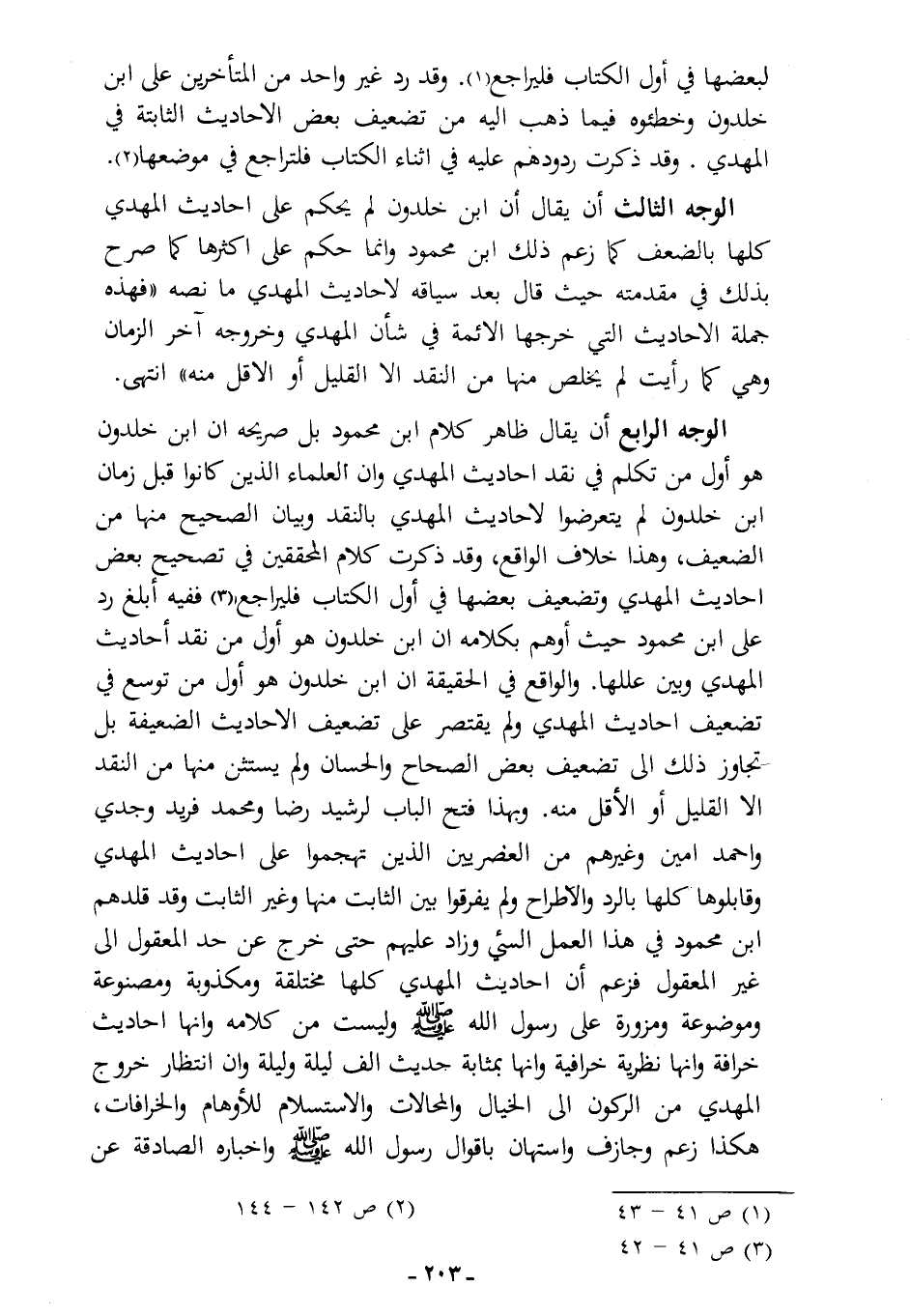 الوجه الرابع: أن يقال: ظاهر كلام ابن محمود بل صريحه أن ابن خلدون هو أول من تكلم في نقد أحاديث المهدي، وأن العلماء الذين كانوا قبل زمان ابن خلدون لم يتعرضوا لأحاديث المهدي بالنقد وبيان الصحيح منها من الضعيف، وهذا خلاف الواقع، وقد ذكرت كلام المحققين في تصحيح بعض أحاديث المهدي وتضعيف بعضها في أول الكتاب فليراجع (¬3)، ففيه أبلغ رد على ابن محمود حيث أوهم بكلامه أن ابن خلدون هو أول من توسع في تضعيف أحاديث المهدي، ولم يقتصر على تضعيف الأحاديث الضعيفة، بل تجاوز ذلك إلى تضعيف بعض الصحاح والحسان، ولم يستثن منها من النقد إلا القليل أو الأقل منه، وبهذا فتح الباب لرشيد رضا ومحمد فريد وجدي وأحمد أمين وغيرهم من العصريين الذين تهجموا على أحاديث المهدي وقابلوها كلها بالرد والإطراح، ولم يفرقوا بين الثابت منها وغير الثابت، وقد قلدهم ابن محمود في هذا العمل السيئ، وزاد عليهم حتى خرج عن حد المعقول إلى غير المعقول، فزعم أن أحاديث المهدي كلها مختلقة ومكذوبة ومصنوعة وموضوعة ومزورة على رسول الله - صلى الله عليه وسلم - وليست من كلامه، وأنها أحاديث خرافة، وأنها نظرية خرافية، وأنها بمثابة حديث ألف ليلة وليلة، وأن انتظار خروج المهدي من الركون إلى الخيال والمحالات، والاستسلام للأوهام والخرافات، هكذا زعم وجازف واستهان بأقوال رسول الله - صلى الله عليه وسلم - وأخباره الصادقة عن ...........................................................