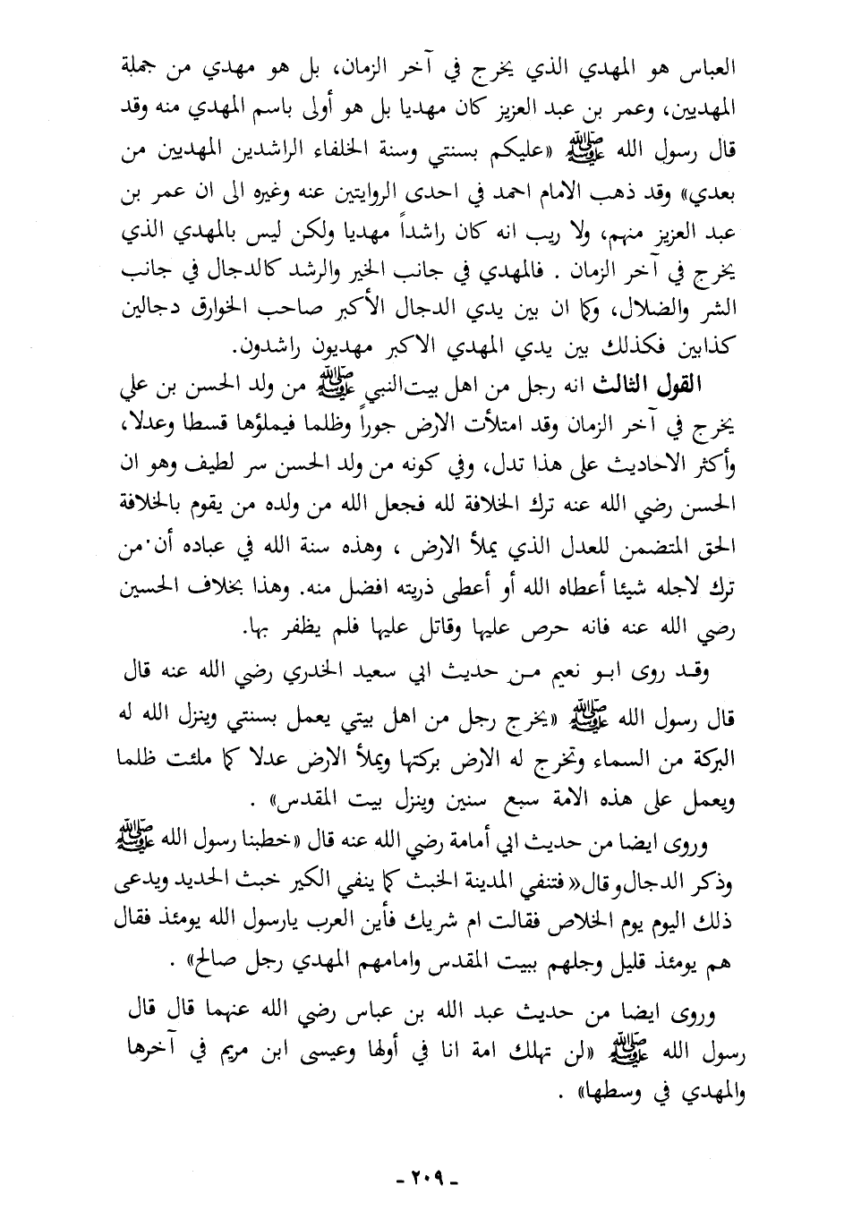 العباس هو المهدي الذي يخرج في آخر الزمان، بل هو مهدي من جملة المهديين، وعمر بن عبد العزيز كان مهديًا، بل هو أولى باسم المهدي منه، وقد قال رسول الله - صلى الله عليه وسلم -: «عليكم بسنتي وسنة الخلفاء الراشدين المهديين من بعدي». وقد ذهب الإمام أحمد في إحدى الروايتين عنه وغيره إلى أن عمر بن عبد العزيز منهم، ولا ريب أنه كان راشدًا مهديًا، ولكن ليس بالمهدي الذي يخرج في آخر الزمان، فالمهدي في جانب الخير والرشد كالدجال في جانب الشر والضلال، وكما أن بين يدي الدجال الأكبر صاحب الخوارق دجالين كذابين، فكذلك بين يدي المهدي الأكبر مهديون راشدون.