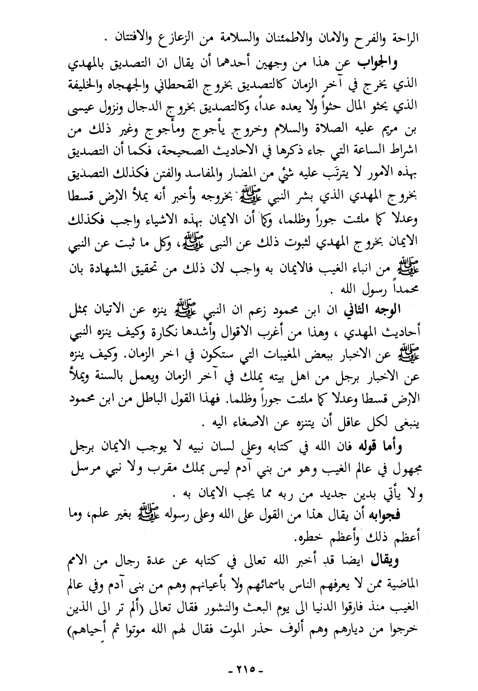 والجواب عن هذا من وجهين؛ أحدهما: أن يقال: إن التصديق بالمهدي الذي يخرج في آخر الزمان كالتصديق بخروج القحطاني والجهجاه، والخليفة الذي يحثو المال حثوًا ولا يعده عدًا، وكالتصديق بخروج الدجال، ونزول عيسى ابن مريم -عليه الصلاة والسلام-، وخروج يأجوج ومأجوج، وغير ذلك من أشراط الساعة التي جاء ذكرها في الأحاديث الصحيحة، فكما أن التصديق بهذه الأمور لا يترتب عليه شيء من المضار والمفاسد والفتن، فكذلك التصديق بخروج المهدي الذي بشر النبي - صلى الله عليه وسلم - بخروجه وأخبر أنه يملأ الأرض قسطًا وعدلا كما ملئت جورًا وظلمًا، وكما أن الإيمان بهذه الأشياء واجب، فكذلك الإيمان بخروج المهدي لثبوت ذلك عن النبي - صلى الله عليه وسلم -، وكل ما ثبتت عن النبي - صلى الله عليه وسلم - من أنباء الغيب فالإيمان به واجب؛ لأن ذلك من تحقيق الشهادة بأن محمدًا رسول الله.