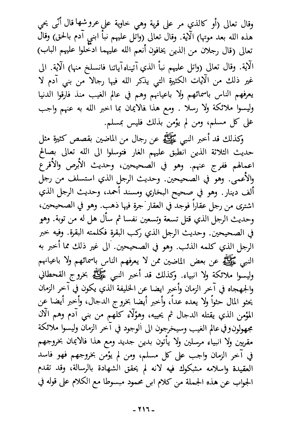 وكذلك قد أخبر النبي - صلى الله عليه وسلم - عن رجال من الماضين بقصص كثيرة؛ مثل حديث الثلاثة الذين انطبق عليهم الغار فتوسلوا إلى الله -تعالى- بصالح أعمالهم ففرج عنهم. وهو في الصحيحين، وحديث الأبرص والأقرع والأعمى. وهو في الصحيحين، وحديث الرجل الذي استسلف من رجل ألف دينار. وهو في صحيح البخاري ومسند أحمد، وحديث الرجل الذي اشترى من رجل عقارًا فوجد في العقار جرة فيها ذهب. وهو في الصحيحين، وحديث الرجل الذي قتل تسعة وتسعين نفسًا ثم سأل هل له من توبة. وهو في الصحيحين، وحديث الرجل الذي ركب البقرة فكلمته البقرة، وفيه خبر الرجل الذي كلمه الذئب. وهو في الصحيحين. إلى غير ذلك مما أخبر به النبي - صلى الله عليه وسلم - عن بعض الماضين، ممن لا يعرفهم الناس بأسمائهم ولا بأعيانهم، وليسوا ملائكة ولا أنبياء، وكذلك قد أخبر النبي - صلى الله عليه وسلم - بخروج القحطاني والجهجاه في آخر الزمان، وأخبر أيضًا عن الخليفة الذي يكون في آخر الزمان يحثو المال حثوًا ولا يعده عدًا، وأخبر أيضًا بخروج الدجال، وأخبر أيضًا عن المؤمن الذي يقتله الدجال ثم يحييه، وهؤلاء كلهم من بني آدم، وهم الآن مجهولون وفي عالم الغيب، وسيخرجون إلى الوجود في آخر الزمان، وليسوا ملائكة مقربين ولا أنبياء مرسلين، ولا يأتون بدين جديد، ومع هذا فالإيمان بخروجهم في آخر الزمان واجب على كل مسلم، ومن لم يؤمن بخروجهم فهو فاسد العقيدة وإسلامه مشكوك فيه؛ لأنه لم يحقق الشهادة بالرسالة، وقد تقدم الجواب عن هذه الجملة من كلام ابن محمود مبسوطًا مع الكلام على قوله في ...................