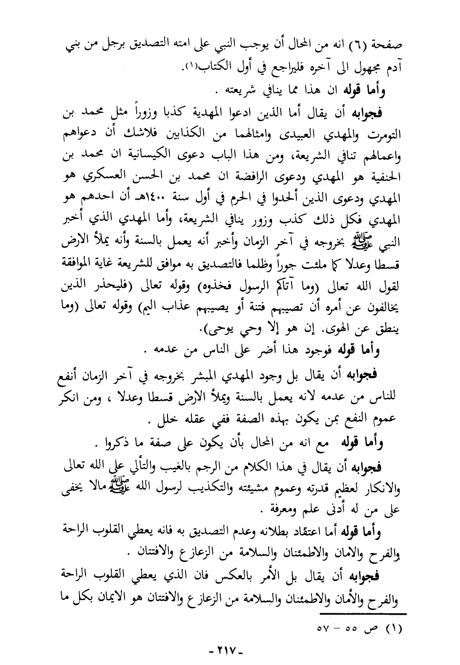 صفحة (6): إنه من المحال أن يوجب النبي على أمته التصديق برجل من بني آدم مجهول ... إلى آخره، فليراجع في أول الكتاب (¬1).