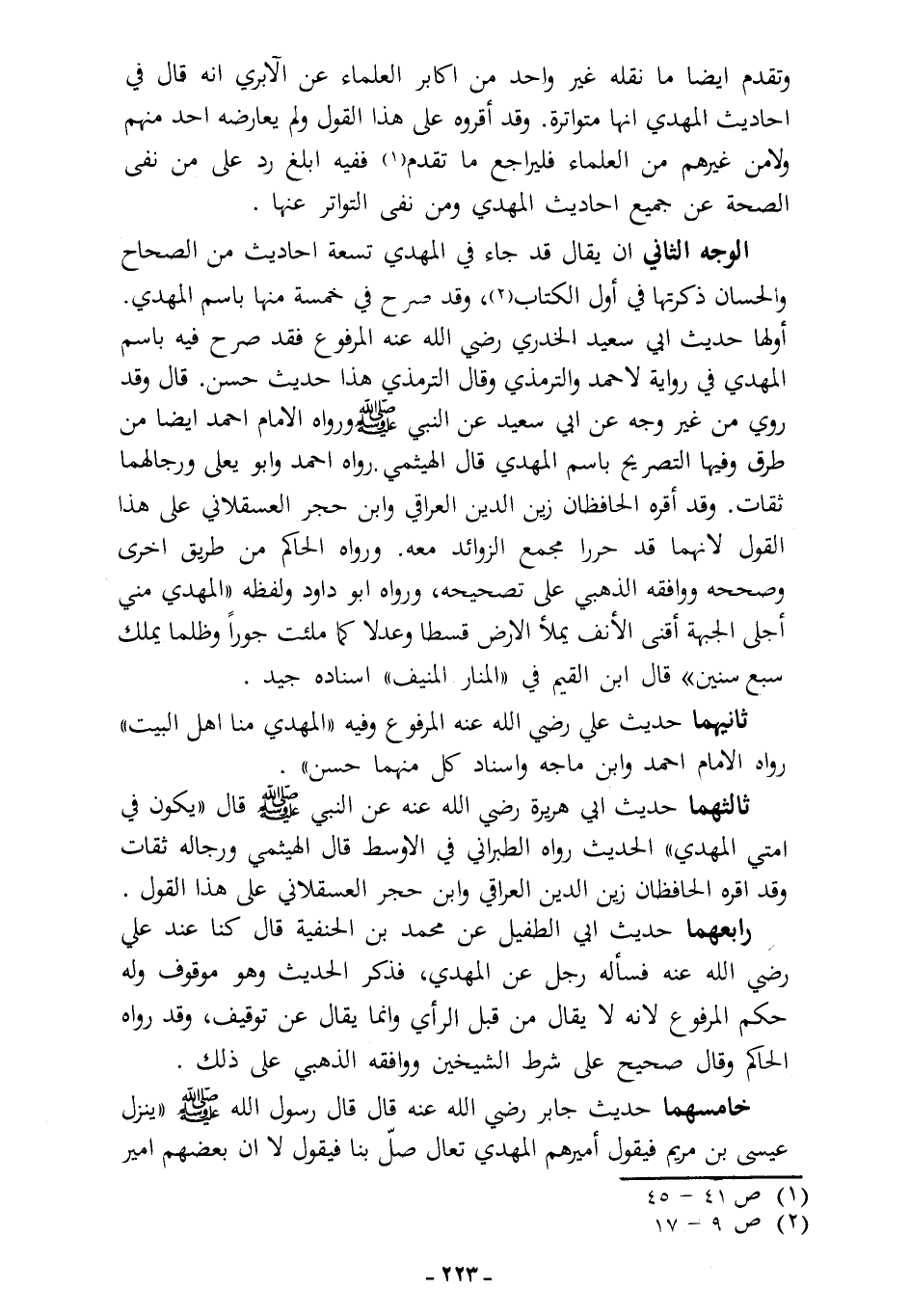 وتقدم أيضًا ما نقله غير واحد من أكابر العلماء عن الآبري، أنه قال في أحاديث المهدي إنها متواترة، وقد أقروه على هذا القول، ولم يعارضه أحد منهم ولا من غيرهم من العلماء، فليراجع ما تقدم (¬1)، ففيه أبلغ رد على من نفى الصحة عن جميع أحاديث المهدي، ومن نفى التواتر عنها.