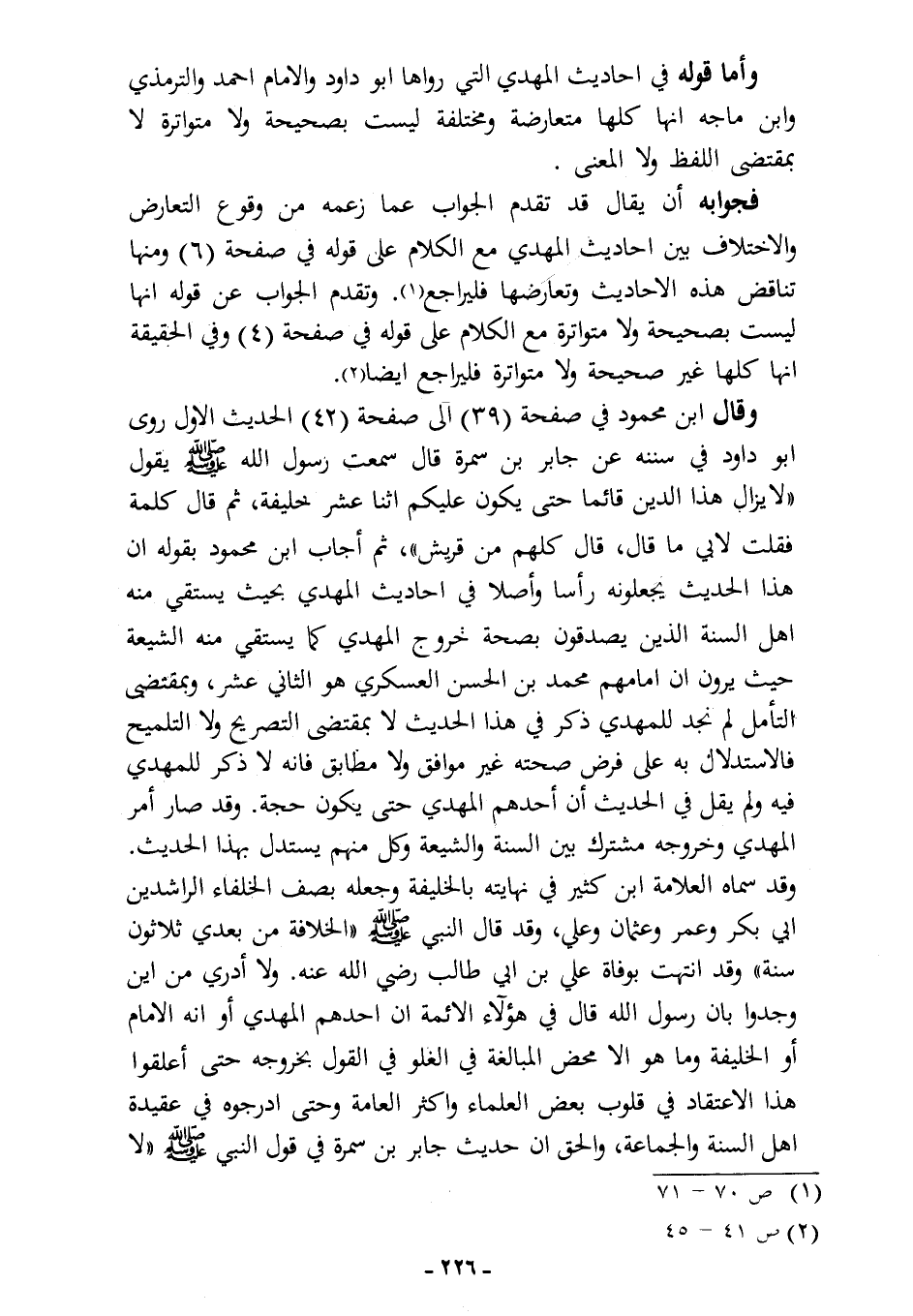 وقال ابن محمود في صفحة (39) إلى صفحة (42): "الحديث الأول: روى أبو داود في سننه، عن جابر بن سمرة قال: سمعت رسول الله - صلى الله عليه وسلم - يقول: «لا يزال هذا الدين قائمًا حتى يكون عليكم اثنا عشر خليفة، ثم قال كلمة، فقلت لأبي: ما قال؟ قال: كلهم من قريش» ثم أجاب ابن محمود بقوله: إن هذا الحديث يجعلونه رأسًا وأصلا في أحاديث المهدي، بحيث يستقي منه أهل السنة الذين يصدقون بصحة خروج المهدي، كما يستقي منه الشيعة حيث يرون أن إمامهم محمد بن الحسن العسكري هو الثاني عشر، وبمقتضى التأمل لم نجد للمهدي ذكر في هذا الحديث، لا بمقتضى التصريح ولا التلميح، فالاستدلال به على فرض صحته غير موافق ولا مطابق، فإنه لا ذكر للمهدي فيه، ولم يقل في الحديث إن أحدهم المهدي حتى يكون حجة، وقد صار أمر المهدي وخروجه مشترك بين السنة والشيعة وكل منهم يستدل بهذا الحديث، وقد سماه العلامة ابن كثير في نهايته بالخليفة، وجعله بصف الخلفاء الراشدين؛ أبي بكر وعمر وعثمان وعلي، وقد قال النبي - صلى الله عليه وسلم -: «الخلافة من بعدي ثلاثون سنة»، وقد انتهت بوفاة علي بن أبي طالب -رضي الله عنه-، ولا أدري من أين وجدوا بأن رسول الله قال في هؤلاء الأئمة أن أحدهم المهدي، أو أنه الإمام أو الخليفة، وما هو إلا محض المبالغة في الغلو في القول بخروجه، حتى أعلقوا هذا الاعتقاد في قلوب بعض العلماء وأكثر العامة، وحتى أدرجوه في عقيدة أهل السنة والجماعة، والحق أن حديث جابر بن سمرة في قول النبي - صلى الله عليه وسلم -: «لا ................