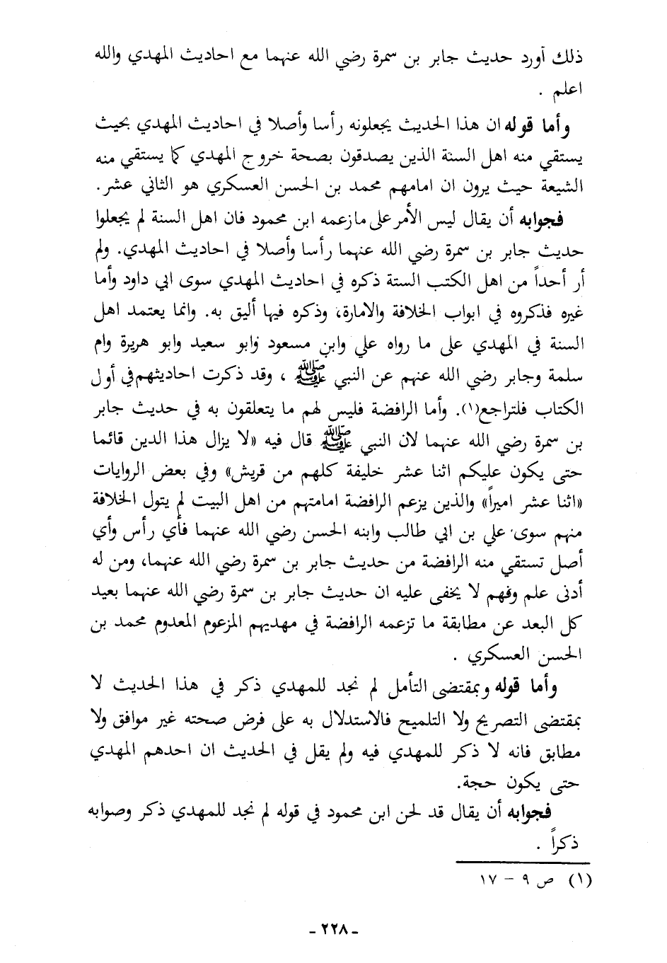 وأما الرافضة فليس لهم ما يتعلقون به في حديث جابر بن سمرة -رضي الله عنهما- لأن النبي - صلى الله عليه وسلم - قال فيه: «لا يزال هذا الدين قائمًا حتى يكون عليكم اثنا عشر خليفة كلهم من قريش» وفي بعض الروايات «اثنا عشر أميرًا»، والذين يزعم الرافضة إمامتهم من أهل البيت لم يتول الخلافة منهم سوى علي بن أبي طالب وابنه الحسن -رضي الله عنهما- فأي رأس وأي أصل تستقي منه الرافضة من حديث جابر بن سمرة -رضي الله عنهما-. ومن له أدنى علم وفهم لا يخفى عليه أن حديث جابر بن سمرة -رضي الله عنهما- بعيد كل البعد عن مطابقة ما تزعمه الرافضة في مهديهم المزعوم المعدوم محمد بن الحسن العسكري.
