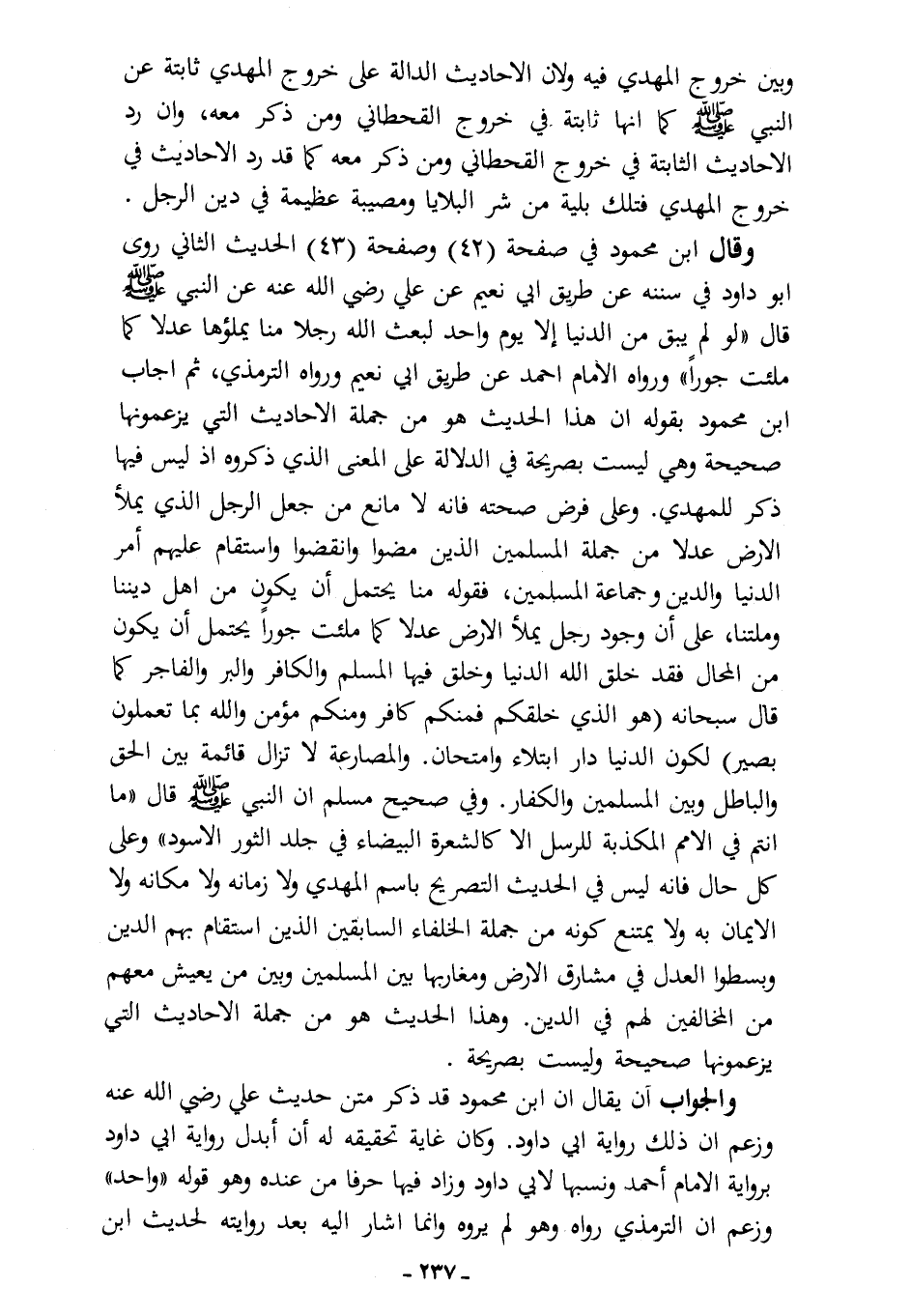 وقال ابن محمود في صفحة (42) وصفحة (43): "الحديث الثاني: روى أبو داود في سننه عن طريق أبي نعيم، عن علي -رضي الله عنه- عن النبي - صلى الله عليه وسلم - قال: «لو لم يبق من الدنيا إلا يوم واحد لبعث الله رجلا مِنَّا يملؤها عدلا كما ملئت جورًا»، ورواه الإمام أحمد عن طريق أبي نعيم، ورواه الترمذي، ثم أجاب ابن محمود بقوله إن هذا الحديث هو من جملة الأحاديث التي يزعمونها صحيحة، وهي ليست بصريحة في الدلالة على المعنى الذي ذكروه، إذ ليس فيها ذكر للمهدي، وعلى فرض صحته فإنه لا مانع من جعل الرجل الذي يملأ الأرض عدلا من جملة المسلمين، الذين مضوا وانقضوا واستقام عليها أمر الدنيا والدين وجماعة المسلمين، فقوله مِنَّا يحتمل أن يكون من أهل ديننا وملتنا، على أن وجود رجل يملأ الأرض عدلا كما ملئت جورًا يحتمل أن يكون من المحال، فقد خلق الله الدنيا وخلق فيها المسلم والكافر والبر والفاجر، كما قال -سبحانه-: {هُوَ الَّذِي خَلَقَكُمْ فَمِنْكُمْ كَافِرٌ وَمِنْكُمْ مُؤْمِنٌ وَاللَّهُ بِمَا تَعْمَلُونَ بَصِيرٌ} لكون الدنيا دار ابتلاء وامتحان، والمصارعة لا تزال قائمة بين الحق والباطل وبين المسلمين والكفار، وفي صحيح مسلم أن النبي - صلى الله عليه وسلم - قال: «ما أنتم في الأمم المكذبة للرسل إلا كالشعرة البيضاء في جلد الثور الأسود»، وعلى كل حال فإنه ليس في الحديث التصريح باسم المهدي ولا زمانه ولا مكانه ولا الإيمان به، ولا يمتنع كونه من جملة الخلفاء السابقين الذين استقام بهم الدين وبسطوا العدل في مشارق الأرض ومغاربها بين المسلمين وبين من يعيش معهم من المخالفين لهم في الدين، وهذا الحديث هو من جملة الأحاديث التي يزعمونها صحيحة وليست بصريحة".