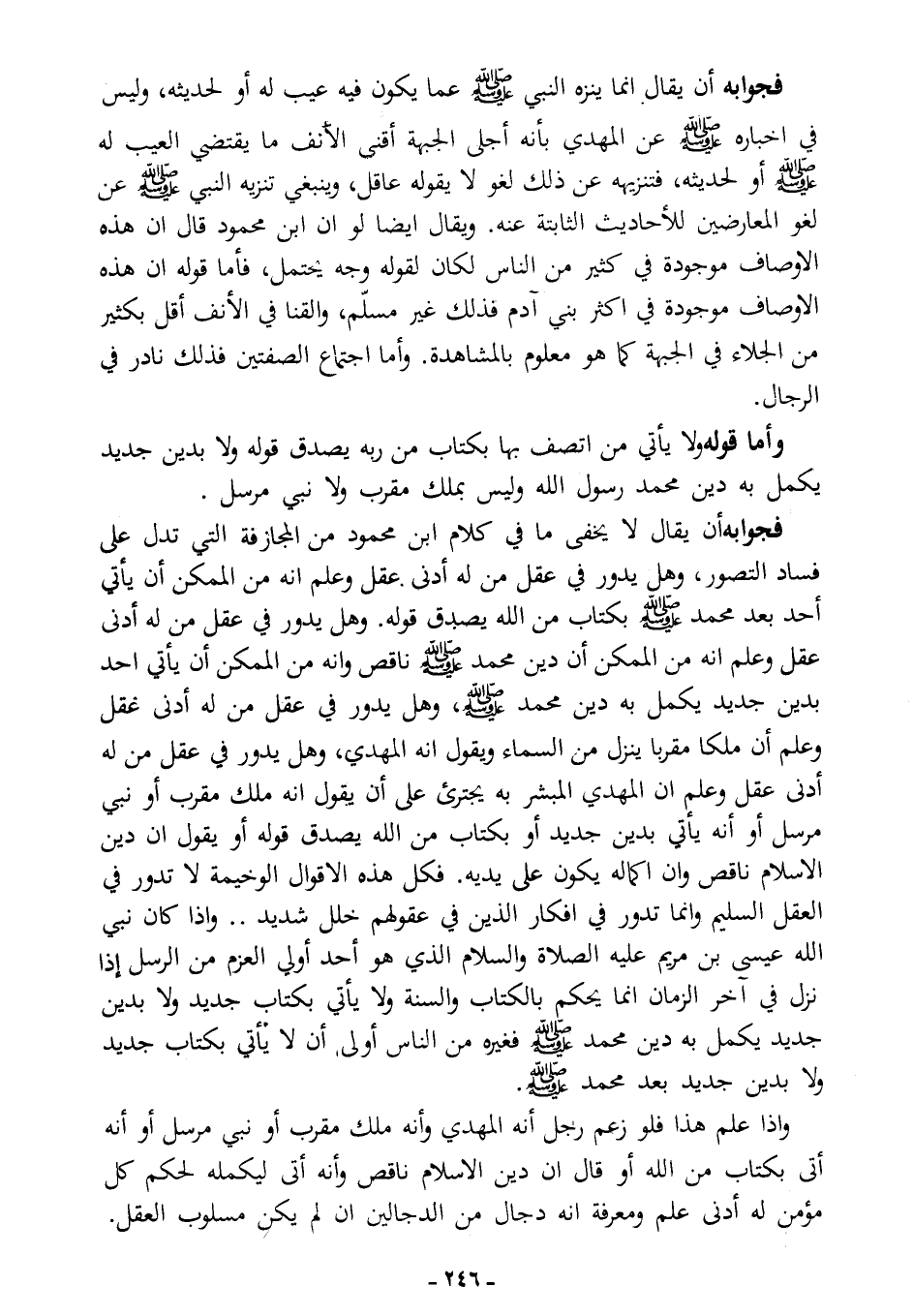 وإذا علم هذا، فلو زعم رجل أنه المهدي، وأنه أتى بكتاب من الله، أو قال إن دين الإسلام ناقص وإنه أتى ليكمله، لحكم كل مؤمن له أدنى علم ومعرفة أنه دجال من الدجالين، إن لم يكن مسلوب العقل.