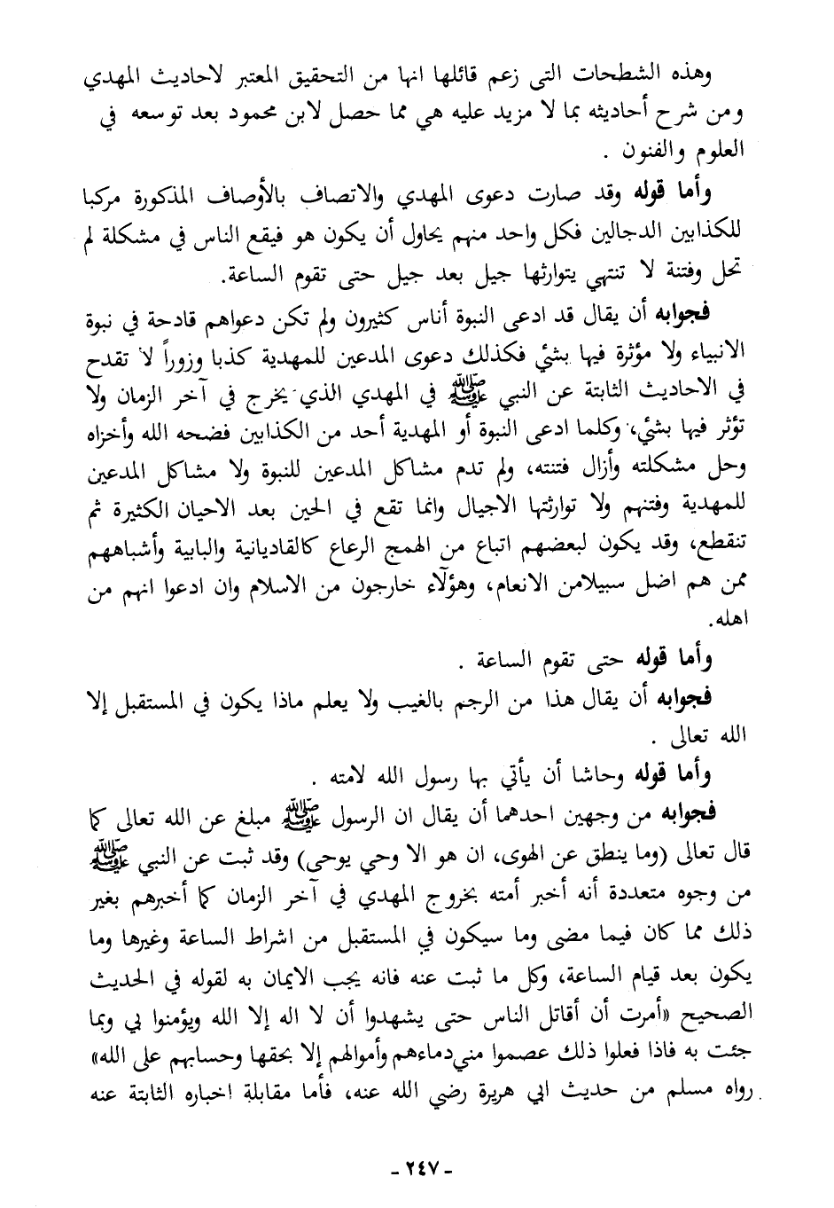 وأما قوله: وقد صارت دعوى المهدي والاتصاف بالأوصاف المذكورة مركبًا للكذابين الدجالين، فكل واحد منهم يحاول أن يكون هو، فيقع الناس في مشكلة لم تحل، وفتنة لا تنتهي، يتوارثها جيل بعد جيل حتى تقوم الساعة.