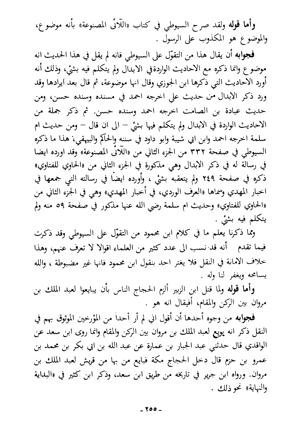 فجوابه: أن يقال: هذا من التقول على السيوطي، فإنه لم يقل في هذا الحديث إنه موضوع، وإنما ذكره مع الأحاديث الواردة في الأبدال ولم يتكلم فيه بشيء، وذلك أنه أورد الأحاديث التي ذكرها ابن الجوزي وقال: إنها موضوعة، ثم قال بعد إيرادها: "وقد ورد ذكر الأبدال من حديث علي، أخرجه أحمد في مسنده وسنده حسن، ومن حديث عبادة بن الصامت، أخرجه أحمد وسنده حسن، ثم ذكر جملة من الأحاديث الواردة في الأبدال، ولم يتكلم فيها بشيء ... إلى أن قال: ومن حديث أم سلمة، أخرجه أحمد، وابن أبي شيبة، وأبو داود في سننه، والحاكم والبيهقي" هذا ما ذكره السيوطي في صفحة (332) من الجزء الثاني من "اللآلئ المصنوعة"، وقد أورده أيضًا في رسالة له في ذكر الأبدال، وهي مذكورة في الجزء الثاني من "الحاوي للفتاوي"، ذكره في صفحة (249) ولم يتعقبه بشيء، وأورده أيضًا في رسالته التي جمعها في أخبار المهدي وسماها "العرف الوردي، في أخبار المهدي" وهي في الجزء الثاني من "الحاوي للفتاوي"، وحديث أم سلمة -رضي الله عنها- مذكور في صفحة (59) منه، ولم يتكلم فيه بشيء.