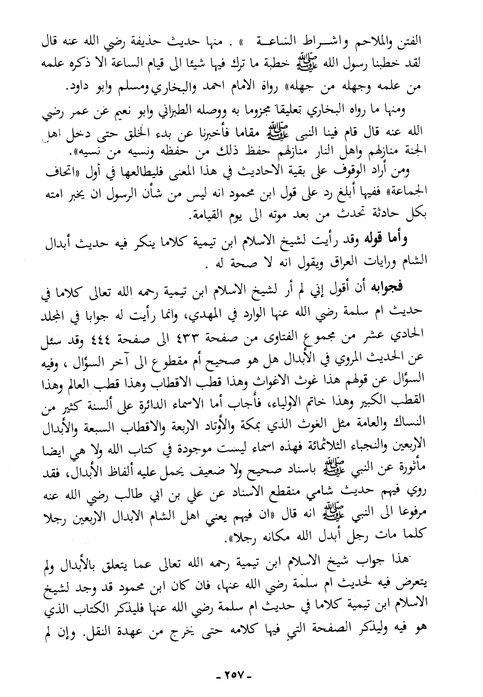 هذا جواب شيخ الإسلام ابن تيمية -رحمه الله تعالى- عما يتعلق بالأبدال، ولم يتعرض فيه لحديث أم سلمة -رضي الله عنها- فإن كان ابن محمود قد وجد لشيخ الإسلام ابن تيمية كلامًا في حديث أم سلمة -رضي الله عنها- فليذكر الكتاب الذي هو فيه، وليذكر الصفحة التي فيها كلامه، حتى يخرج من عهدة النقل، وإن لم .......................