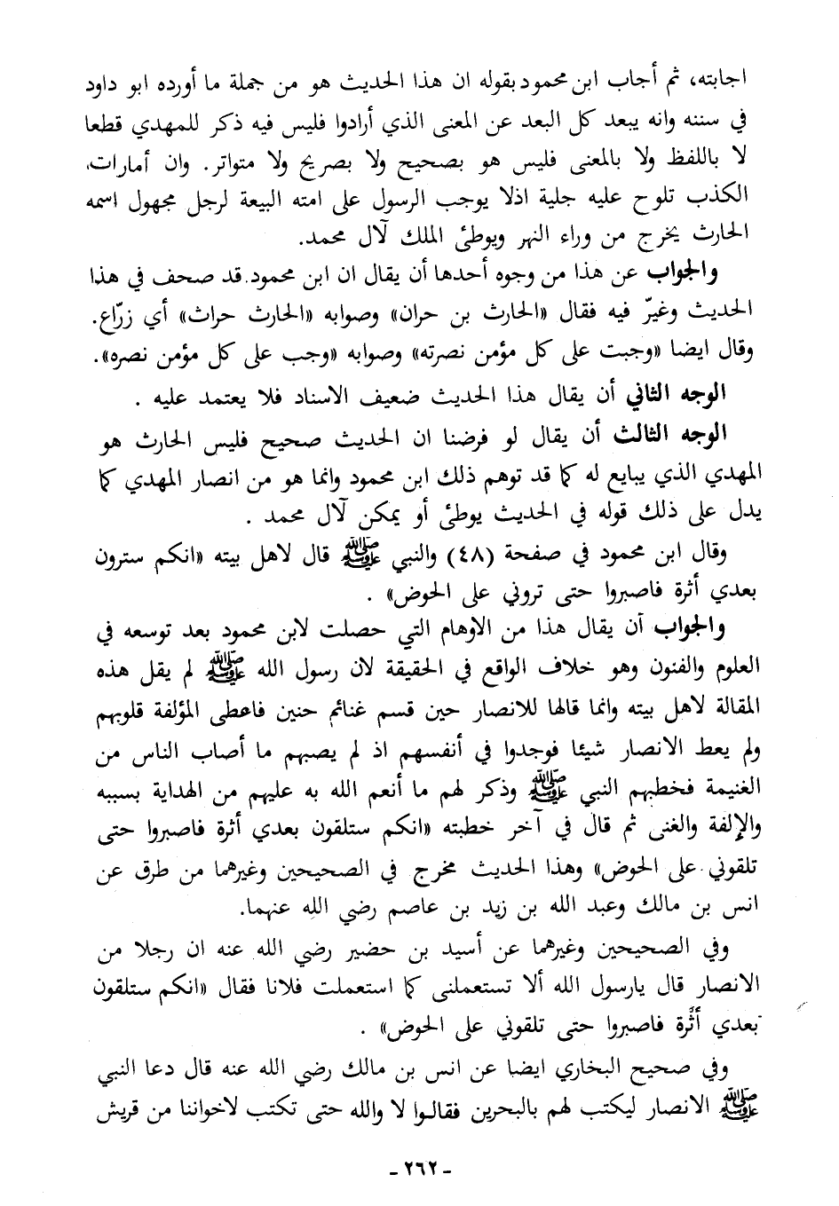 إجابته». ثم أجاب ابن محمود بقوله: إن هذا الحديث هو من جملة ما أورده أبو داود في سننه، وإنه يبعد كل البعد عن المعنى الذي أرادوا، فليس فيه ذكر للمهدي قطعًا لا باللفظ ولا بالمعنى، فليس هو بصحيح ولا بصريح ولا متواتر، وإن أمارات الكذب تلوح عليه جلية؛ إذ لا يوجب الرسول على أمته البيعة لرجل مجهول اسمه الحارث يخرج من وراء النهر، ويوطئ الملك لآل محمد".