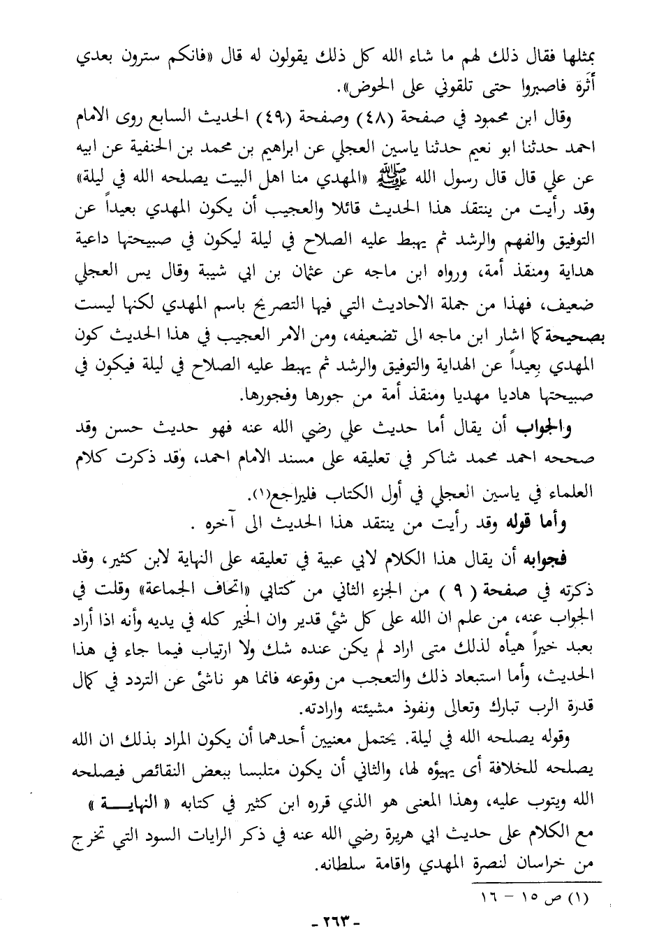 وقال ابن محمود في صفحة (48) وصفحة (49): "الحديث السابع: روى الإمام أحمد، حدثنا أبو نعيم، حدثنا ياسين العجلي، عن إبراهيم بن محمد بن الحنفية، عن أبيه، عن علي، قال: قال رسول الله - صلى الله عليه وسلم -: «المهدي منا أهل البيت، يصلحه الله في ليلة». وقد رأيت من ينتقد هذا الحديث قائلا: والعجيب أن يكون المهدي بعيدًا عن التوفيق والفهم والرشد، ثم يهبط عليه الصلاح في ليلة ليكون في صبيحتها داعية هداية منقذ أمة، ورواه ابن ماجة عن عثمان بن أبي شيبة، وقال: ياسين العجلي ضعيف، فهذا من جملة الأحاديث التي فيها التصريح باسم المهدي لكنها ليست بصحيحة كما أشار ابن ماجة إلى تضعيفه، ومن الأمر العجيب في هذا الحديث كون المهدي بعيدًا عن الهداية والتوفيق والرشد، ثم يهبط عليه الصلاح في ليلة فيكون في صبيحتها هاديًا مهديًا، ومنقذ أمة من جورها وفجورها".
