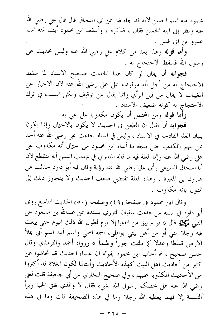 وقال ابن محمود في صفحة (49) وصفحة (50): "الحديث التاسع: روى أبو داود في سننه، من حديث سفيان الثوري بسنده، عن عبد الله بن مسعود، عن النبي - صلى الله عليه وسلم - قال: «لو لم يبق من الدنيا إلا يوم لطوَّل الله ذلك اليوم، حتى يبعث فيه رجلا مِنِّي أو من أهل بيتي، يواطئ اسمه اسمي، واسم أبيه اسم أبي، يملأ الأرض قسطًا وعدلا كما ملئت جورًا وظلمًا» ورواه أحمد والترمذي، وقال: "حسن صحيح". ثم أجاب ابن محمود بقوله: إن علماء الحديث قد تحاشوا عن كثير من أحاديث أهل البيت؛ كهذه الأحاديث وأمثالها؛ لكون الغلاة قد أكثروا من الأحاديث المكذوبة عليهم، وفي صحيح البخاري عن أبي جحيفة قلت لعلي -رضي الله عنه-:" هل خصَّكم رسول الله بشيء؟ فقال: لا، والذي فلق الحبة وبرأ النسمة، إلا فهما يعطيه الله رجلا، وما في هذه الصحيفة، قلت: وما في هذه ..........