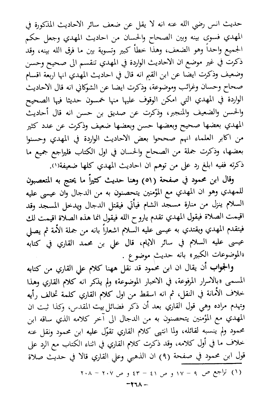 حديث أنس -رضي الله عنه- إنه لا يقل عن ضعف سائر الأحاديث لمذكورة في المهدي، فسوَّى بينه وبين الصحاح والحسان من أحاديث المهدي، وجعل حكم الجميع واحدًا وهو الضعف، وهذا خطأ كبير وتسوية بين ما فرق الله بينه، وقد ذكرت في غير موضع أن الأحاديث الواردة في المهدي تنقسم إلى صحيح وحسن وضعيف، وذكرت أيضًا عن ابن القيم أنه قال في أحاديث المهدي: "إنها أربعة أقسام؛ صحاح، وحسان، وغرائب، وموضوعة"، وذكرت أيضًا عن الشوكاني أنه قال: "الأحاديث الواردة في المهدي التي أمكن الوقوف عليها منها خمسون حديثًا، فيها الصحيح والحسن والضعيف والمنجبر"، وذكرت عن صديق بن حسن أنه قال: "أحاديث المهدي بعضها صحيح وبعضها حسن وبعضها ضعيف"، وذكرت عن عدد كثير من أكابر العلماء أنهم صححوا بعض الأحاديث الواردة في المهدي وحسنوا بعضها، وذكرت جملة من الصحاح والحسان في أول الكتاب، فليراجع جميع ما ذكرته، ففيه أبلغ رد على من توهم أن أحاديث المهدي كلها ضعيفة (¬1).