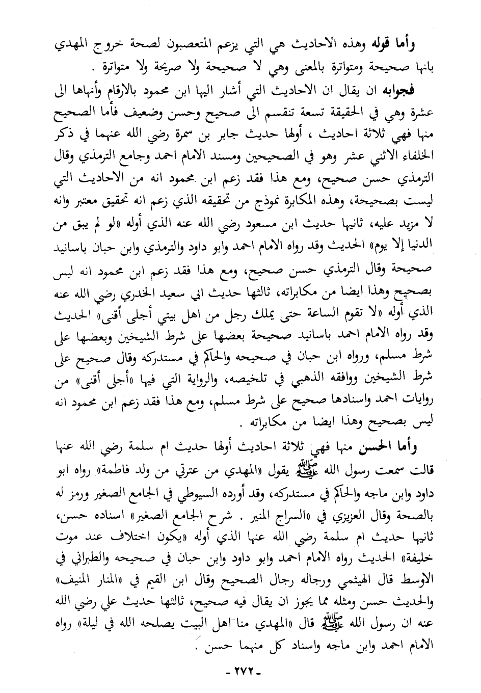 فجوابه: أن يقال: إن الأحاديث التي أشار إليها ابن محمود بالأرقام وأنهاها إلى عشرة وهي في الحقيقة تسعة تنقسم إلى صحيح وحسن وضعيف، فأما الصحيح منها فهي ثلاثة أحاديث؛ أولها حديث جابر بن سمرة -رضي الله عنهما- في ذكر الخلفاء الاثني عشر، وهو في الصحيحين، ومسند الإمام أحمد، وجامع الترمذي، وقال الترمذي: "حسن صحيح"، ومع هذا فقد زعم ابن محمود أنه من الأحاديث التي ليست بصحيحة، وهذه المكابرة نموذج من تحقيقه الذي زعم أنه تحقيق معتبر وأنه لا مزيد عليه. ثانيها حديث ابن مسعود -رضي الله عنه- الذي أوله: «لو لم يبق من الدنيا إلا يوم» الحديث، وقد رواه الإمام أحمد، وأبو داود، والترمذي، وابن حبان بأسانيد صحيحة، وقال الترمذي: "حسن صحيح"، ومع هذا فقد زعم ابن محمود أنه ليس بصحيح، وهذا أيضًا من مكابراته. ثالثها حديث أبي سعيد الخدري -رضي الله عنه- الذي أوله: «لا تقوم الساعة حتى يملك رجل من أهل بيتي أجلى أقنى» الحديث، وقد رواه الإمام أحمد بأسانيد صحيحة، بعضها على شرط الشيخين وبعضها على شرط مسلم، ورواه ابن حبان في صحيحه، والحاكم في مستدركه، وقال: "صحيح على شرط الشيخين"، ووافقه الذهبي في تلخيصه، والرواية التي فيها: «أجلى أقنى» من روايات أحمد، وإسنادها صحيح على شرط مسلم، ومع هذا فقد زعم ابن محمود أنه ليس بصحيح وهذا أيضًا من مكابراته.