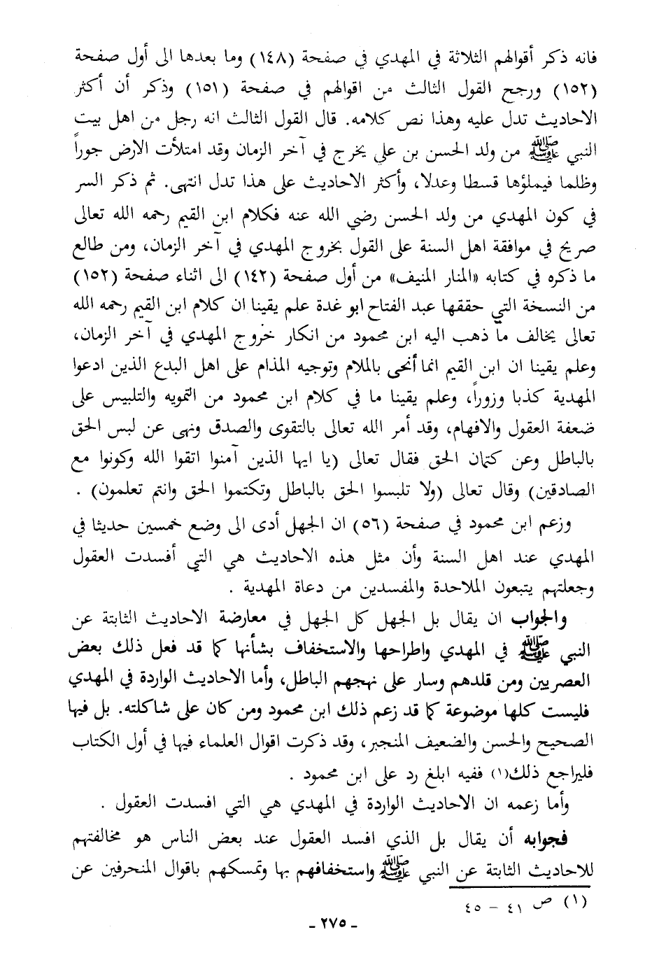 فإنه ذكر أقوالهم الثلاثة في المهدي في صفحة (148) وما بعدها إلى أول صفحة (152)، ورجح القول الثالث من أقوالهم في صفحة (151)، وذكر أن أكثر الأحاديث تدل عليه، وهذا نَصُّ كلامه، قال: "القول الثالث: أنه رجل من أهل بيت النبي - صلى الله عليه وسلم - من ولد الحسن بن علي، يخرج في آخر الزمان وقد امتلأت الأرض جورًا وظلمًا فيملؤها قسطًا وعدلا، وأكثر الأحاديث على هذا تدل". انتهى، ثم ذكر السر في كون المهدي من ولد الحسن -رضي الله عنه-، فكلام ابن القيم -رحمه الله تعالى- صريح في موافقة أهل السنة على القول بخروج المهدي في آخر الزمان، ومن طالع ما ذكره في كتابه "المنار المنيف" من أول صفحة (142) إلى أثناء صفحة (152) من النسخة التي حققها عبد الفتاح أبو غدة، علم يقينًا أن كلام ابن القيم -رحمه الله تعالى- يخالف ما ذهب إليه ابن محمود من إنكار خروج المهدي في آخر الزمان، وعلم يقينًا أن ابن القيم إنما أنحى بالملام وتوجيه المذام على أهل البدع الذين ادعوا المهدية كذبًا وزورًا، وعلم يقينًا ما في كلام ابن محمود من التمويه والتلبيس على ضعفة العقول والأفهام، وقد أمر الله -تعالى- بالتقوى والصدق، ونهى عن لبس الحق بالباطل وعن كتمان الحق، فقال -تعالى-: {يَا أَيُّهَا الَّذِينَ آَمَنُوا اتَّقُوا اللَّهَ وَكُونُوا مَعَ الصَّادِقِينَ}، وقال -تعالى-: {وَلَا تَلْبِسُوا الْحَقَّ بِالْبَاطِلِ وَتَكْتُمُوا الْحَقَّ وَأَنْتُمْ تَعْلَمُونَ}.