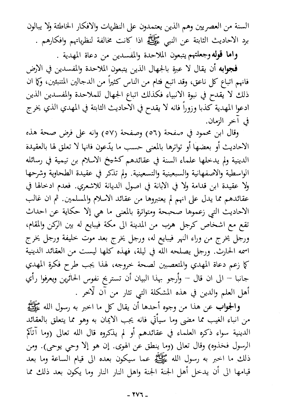 وقال ابن محمود في صفحة (56) وصفحة (57): "وإنه على فرض صحة هذه الأحاديث أو بعضها أو تواترها بالمعنى حسب ما يدعون، فإنها لا تعلق لها بالعقيدة الدينية، ولم يدخلها علماء السنة في عقائدهم؛ كشيخ الإسلام بن تيمية في رسائله الواسطية، والأصفهانية، والسبعينية، والتسعينية، ولم تُذكر في عقيدة الطحاوية وشرحها، ولا عقيدة ابن قدامة، ولا في الإبانة في أصول الديانة للأشعري، فعدم إدخالها في عقائدهم مما يدل على أنهم لم يعتبروها من عقائد الإسلام والمسلمين، ثم إن غالب الأحاديث التي زعموها صحيحة ومتواترة بالمعنى ما هي إلا حكاية عن أحداث تقع مع أشخاص؛ كرجل هرب من المدينة إلى مكة فيبايع له بين الركن والمقام، ورجل يخرج من وراء النهر فيبايع له، ورجل يخرج بعد موت خليفة، ورجل يخرج اسمه الحارث، ورجل يصلحه الله في ليلة، فهذه كلها ليست من العقائد الدينية كما زعم دعاة المهدي والمتعصبين لصحة خروجه، لهذا يجب طرح فكرة المهدي جانبًا ... إلى أن قال: وأرجو بهذا البيان أن تستريح نفوس الحائرين، ويعرفوا رأي أهل العلم والدين في هذه المشكلة التي تُثَار من آنٍ لآخر".