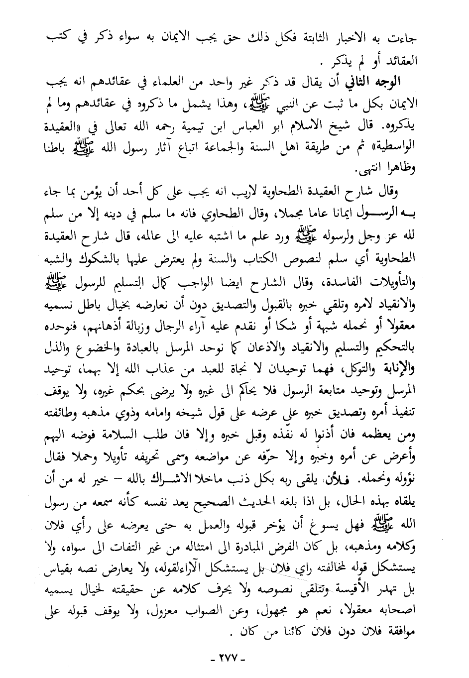 وقال شارح العقيدة الطحاوية: "لا ريب أنه يجب على كل أحد أن يؤمن بما جاء به الرسول إيمانًا عامًا مجملا"، وقال الطحاوي: "فإنه ما سلم في دينه إلا من سلّم لله -عز وجل- ولرسوله - صلى الله عليه وسلم - وردّ علم ما اشتبه عليه إلى عالِمِه"، قال شارح العقيدة الطحاوية: "أي سلَّم لنصوص الكتاب والسنة، ولم يعترض عليها بالشكوك والشبه والتأويلات الفاسدة"، وقال الشارح أيضًا: "الواجب كمال التسليم للرسول - صلى الله عليه وسلم -، والانقياد لأمره، وتلقي خبره بالقبول والتصديق دون أن نعارضه بخيال باطل، نسميه معقولا، أو نحمله شبهة أو شكا، أو نقدم عليه آراء الرجال وزبالة أذهانهم، فنوحده بالتحكيم والتسليم والانقياد والإذعان، كما نوحد المُرسِل بالعبادة والخضوع والذل والإنابة والتوكل، فهما توحيدان لا نجاة للعبد من عذاب الله إلا بهما؛ توحيد المُرسِل، وتوحيد متابعة الرسول، فلا يحاكم إلى غيره، ولا يرضى بحكم غيره، ولا يوقف تنفيذ أمره وتصديق خبره على عرضه على قول شيخه وإمامه وذوي مذهبه وطائفته ومن يعظمه، فإن أذنوا له نفَّذه وقبل خبره، وإلا فإن طلب السلامة فوضه إليهم وأعرض عن أمره وخبره، وإلا حرَّفه عن مواضعه وسمَّى تحريفه تأويلا وحملا، فقال نؤوله ونحمله.