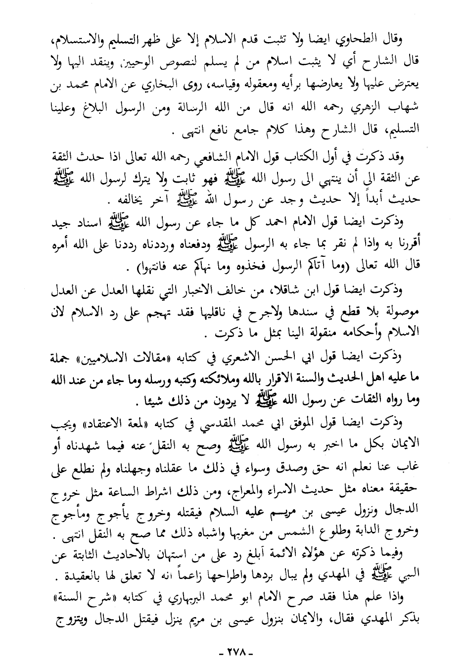 وفيما ذكرته عن هؤلاء الأئمة أبلغ رد على من استهان بالأحاديث الثابتة عن النبي - صلى الله عليه وسلم - في المهدي ولم يبال بردها وإطراحها زاعمًا أنه لا تعلق لها بالعقيدة.