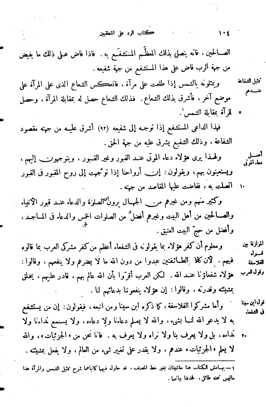 وأما مشركوا الفلاسفة كما ذكره ابن سينا ومن اتبعه فيقولون أن من يستشفع به لا يدعو الله لنا بشئ والله لا يعلم دعاءنا ولا دعاءه ولا يسمع نداءنا ولا نداءه بل ولا يعرف بنا ولا نراه ولا يعرف به فانا نحن من الجزئيات والله لا يعلم الجزئيات عندهم ولا يقدر على تغيير شيء من العالم ولا يفعل بمشيئته