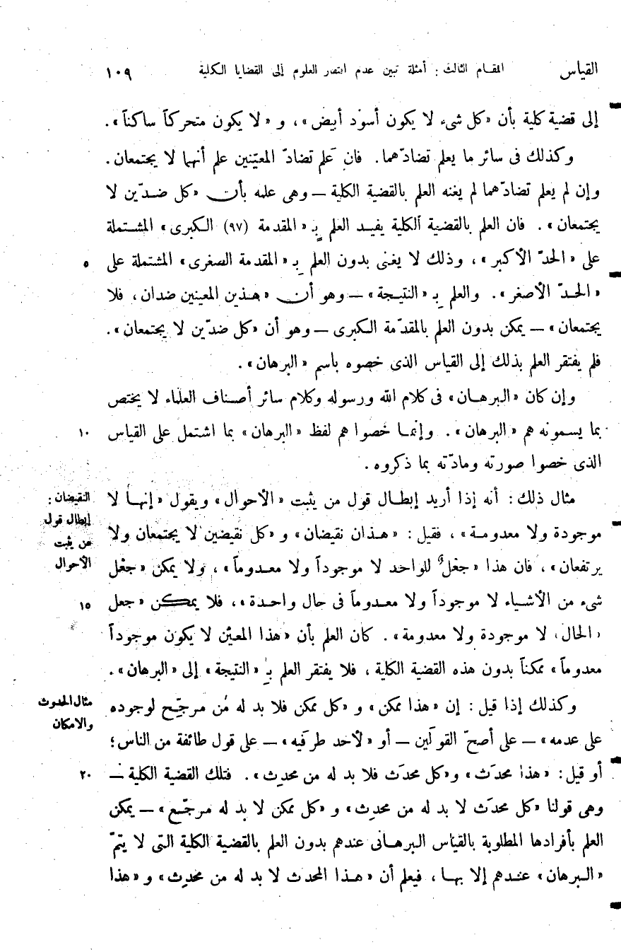 إلى قضية كلية بان كل شيء لا يكون اسود أبيض ولا يكون متحركا ساكنا وكذلك في سائر ما يعلم تضادهما فان علم تضاد المعينين علم أنهما لا يجتمعان وإن لم يعلم تضادهما لم يغنه العلم بالقضية الكلية وهي علمه بأن كل ضدين لا يجتمعان فان العلم بالقضية الكلية يفيد العلم ب المقدمة الكبرى المشتملة على الحد الأكبر وذلك لا يغنى بدون العلم ب المقدمة الصغرى المشتملة على الحد الأصغر والعلم بالنتيجة وهو أن هذين المعينين ضدان فلا يجتمعان يمكن بدون العلم بالمقدمة الكبرى وهو أن كل ضدين لا يجتمعان فلم يفتقر العلم بذلك إلى القياس الذي خصوه باسم البرهان.