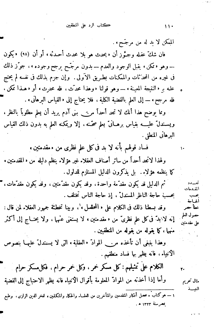 وقد بسطنا ذلك في الكلام على المحصل وبينا تخطئة جمهور العقلاء لمن قال أنه لا بد في كل علم نظري من مقدمتين لا يستغنى عنهما ولا يحتاج إلى أكثر منهما كما يقوله من يقوله من المنطقيين.