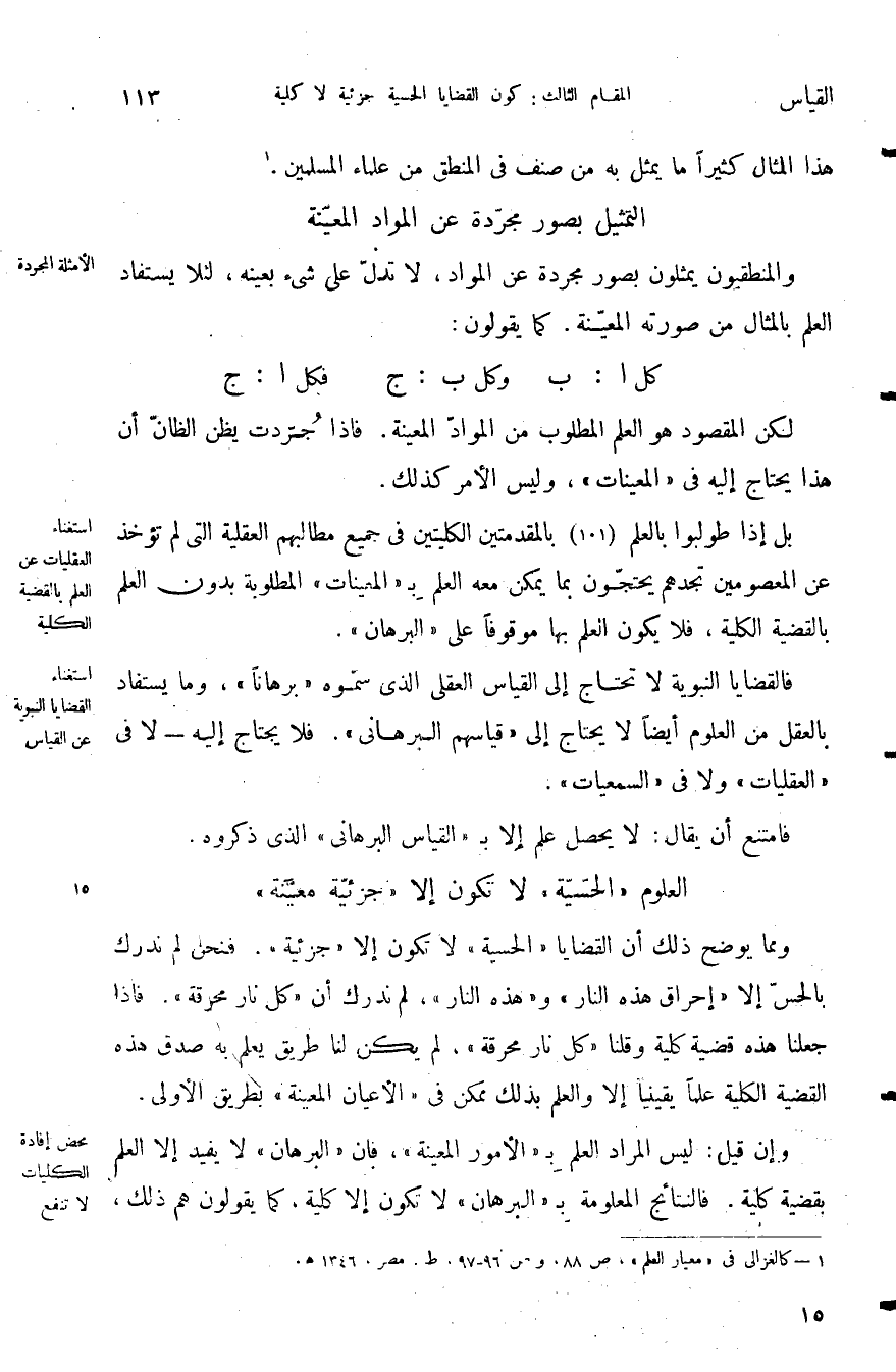 والمنطقيون يمثلون بصور مجردة عن المواد لا تدل على شيء يعينه لئلا يستفاد العل بالمثال من صورته المعينة كما يقولون: