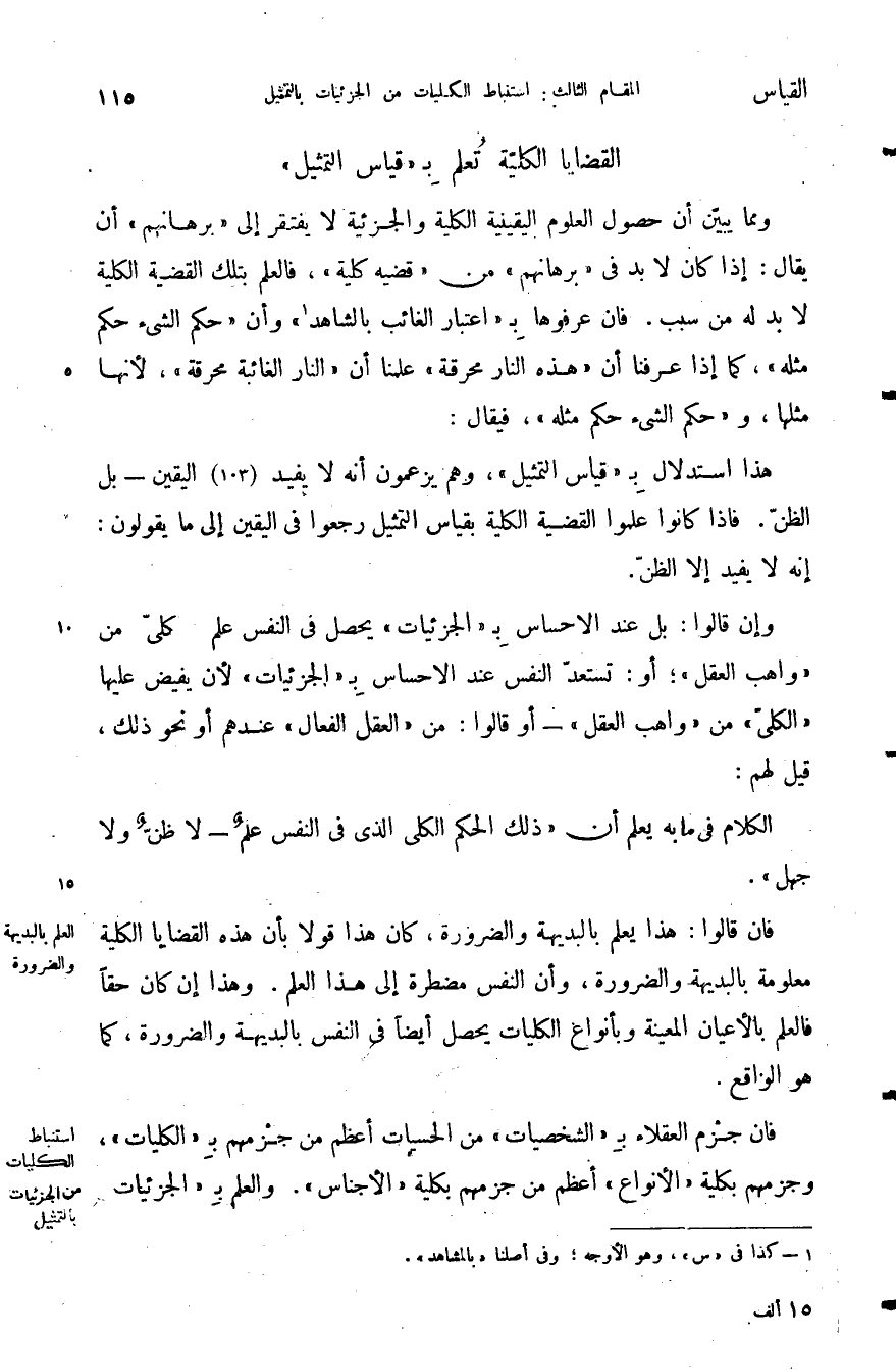 هذا استدلال ب قياس التمثيل وهم يزعمون أنه لا يفيد اليقين بل الظن فإذا كانوا علموا القضية الكلية بقياس التمثيل رجعوا في اليقين إلى ما يقولون أنه لا يفيد إلا الظن.