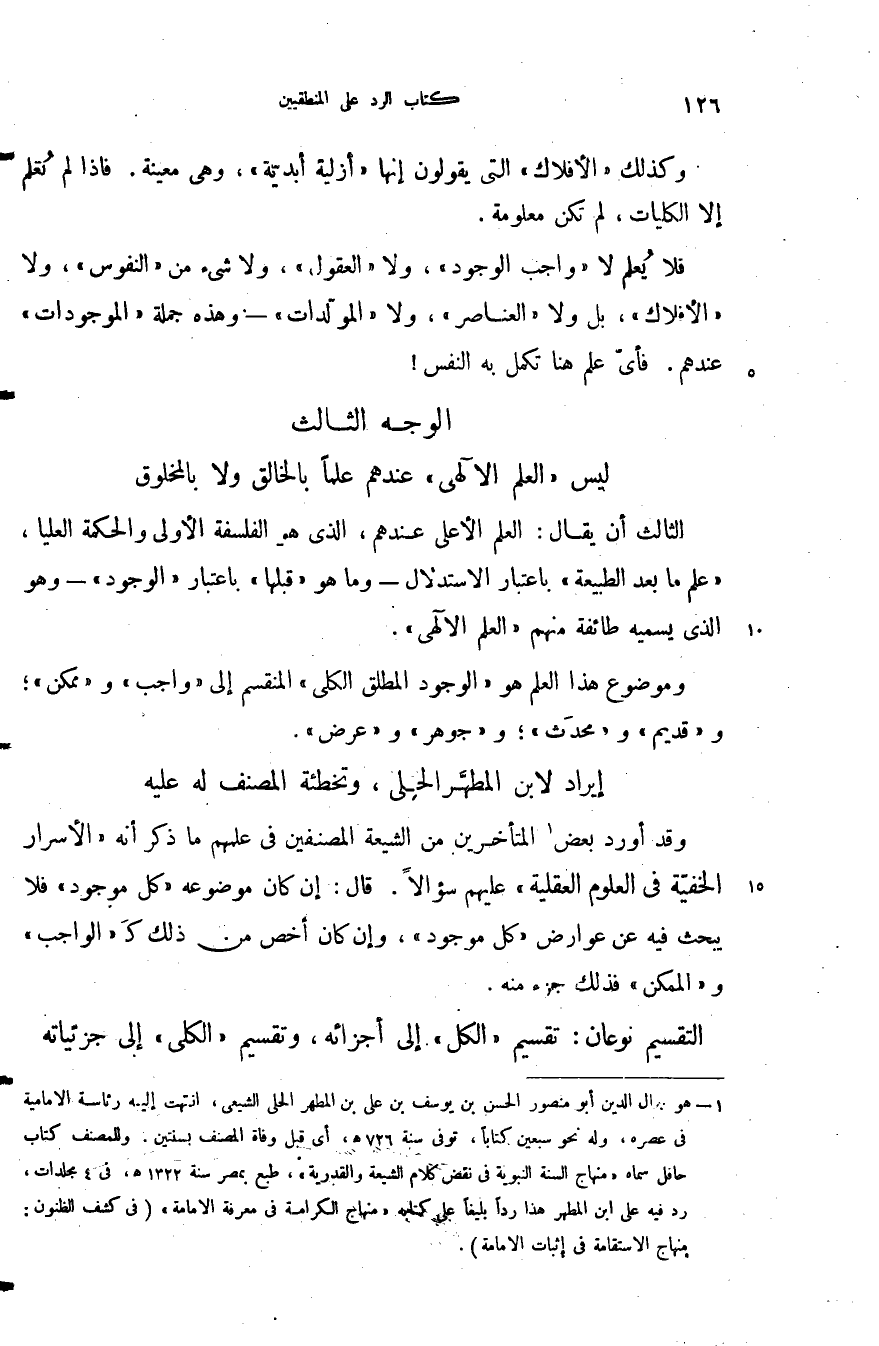 وقد أورد بعض المتأخرين من الشيعة المصنفين في علمهم ما ذكره أنه الأسرار الخفية في العلوم العقلية عليهم سؤالا قال: إن كان موضوعه كل موجود فلا يبحث فيه عن عوارض كل موجود وإن كان أخص من ذلك كالواجب والممكن فذلك جزء منه.