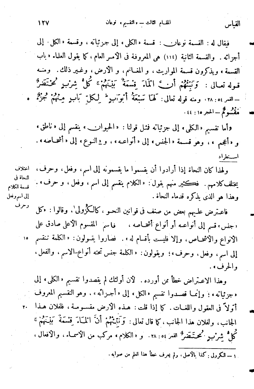 وهذا الاعتراض خطأ ممن أورده لأن أولئك لم يقصدوا تقسيم الكلى إلى جزئياته وإنما قصدوا تقسيم الكل إلى أجزائه وهو التقسيم المعروف أولا في العقول واللغات كما إذا قلت هذه الأرض مقسومة فلفلان هذا الجانب ولفلان هذا الجانب كما قال تعالى: {وَنَبِّئْهُمْ أَنَّ الْمَاءَ قِسْمَةٌ بَيْنَهُمْ كُلُّ شِرْبٍ مُحْتَضَرٌ} والكلام مركب من الأسماء والأفعال