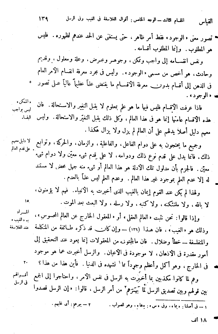 ونفس انقسامه إلى واجب وممكن وجوهر وعرض وعلة ومعلول وقديم وحادث هو اخص من مسمى الوجود وليس في مجرد معرفة انقسام الأمر العام في الذهن إلى أقسام بدون معرفة الأقسام ما يقتضى علما عظيما عاليا على تصور الوجود.
