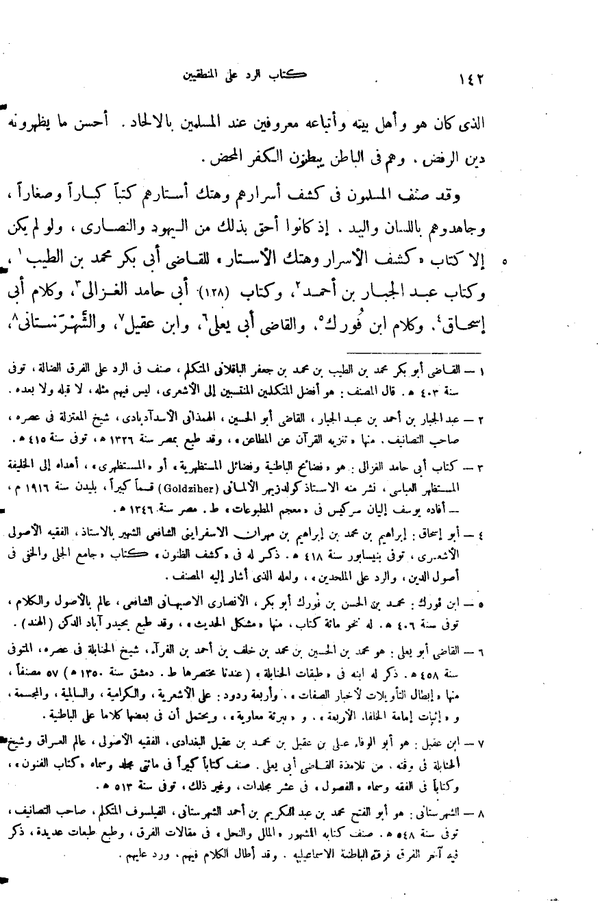وقد صنف المسلمون في كشف اسرارهم وهتك استارهم كتبا كبارا وصغارا وجاهدوهم باللسان واليد إذ كانوا أحق بذلك من اليهود والنصارى ولو لم يكن إلا كتاب كشف الأسرار وهتك الأستار للقاضي أبي بكر محمد بن الطيب وكتاب عبد الجبار بن احمد وكتاب أبي حامد الغزالي وكلام أبي إسحاق وكلام ابن فورك والقاضي أبي يعلى وابن عقيل والشهر ستاني