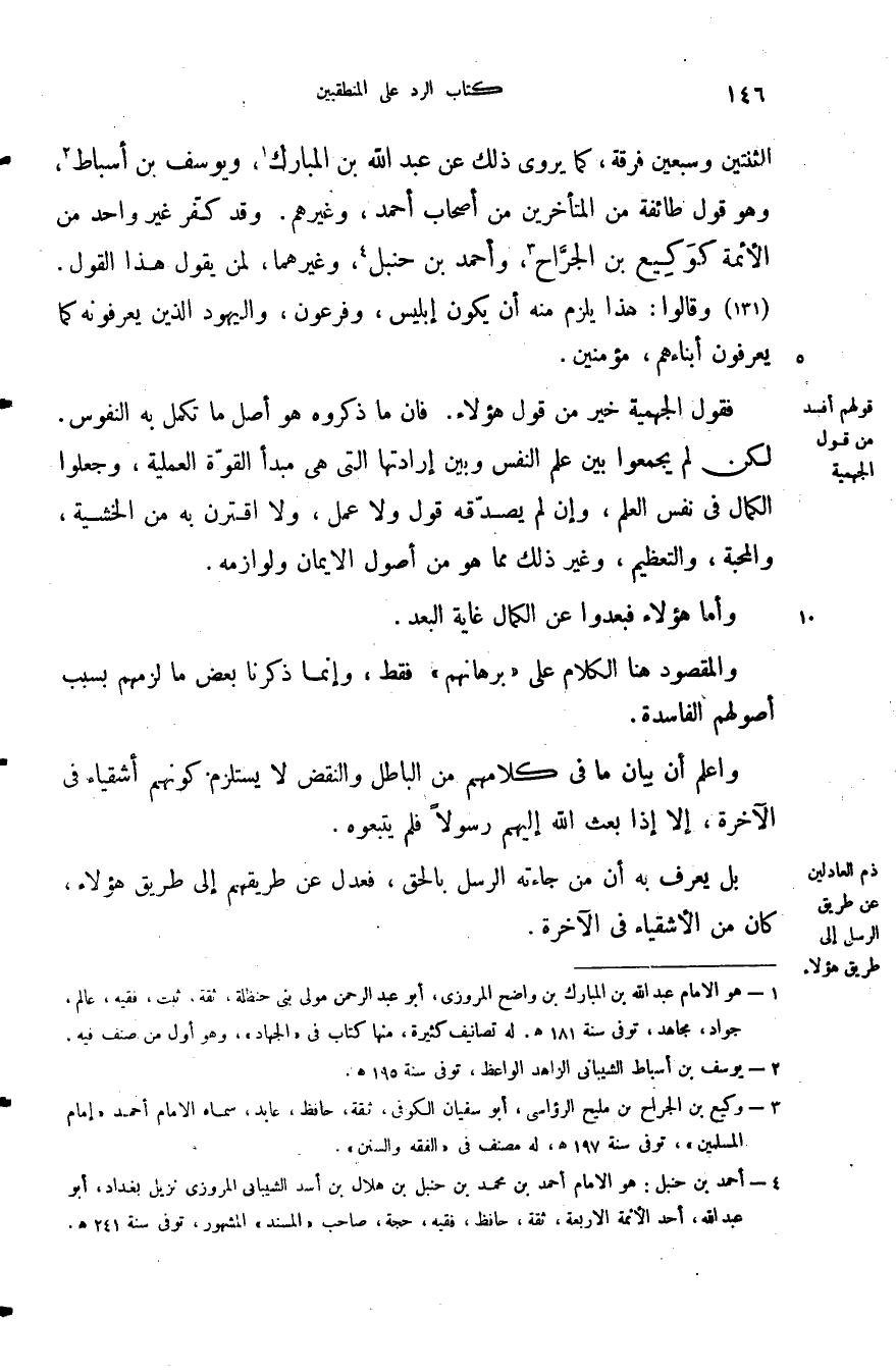 اثنتين وسبعين فرقة كما يروى ذلك عن عبد الله بن المبارك ويوسف بن أسباط وهو قول طائفة من المتأخرين من أصحاب احمد وغيرهم وقد كفر غير واحد من الأئمة كوكيع بن الجراح وأحمد بن حنبل وغيرهما لمن يقول هذا القول وقالوا هذا يلزم منه أن يكون إبليس وفرعون واليهود الذين يعرفونه كما يعرفون أبناءهم مؤمنين.