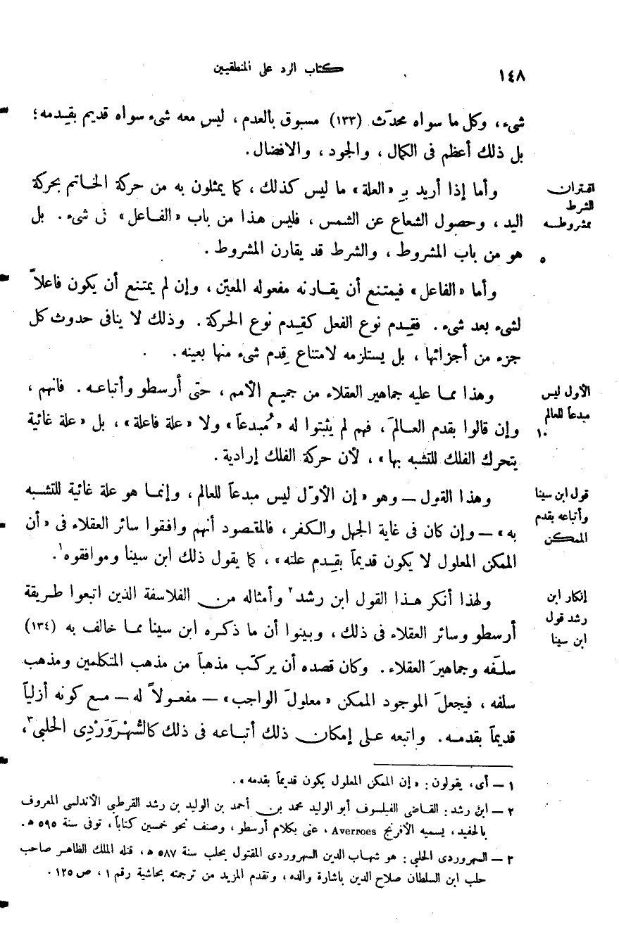 ولهذا أنكر هذا القول ابن رشد وأمثاله من الفلاسفة الذين اتبعوا طريقة أرسطو وسائر العقلاء في ذلك وبينوا أن ما ذكره ابن سينا مما خالف به سلفه وجماهير العقلاء وكان قصده أن يركب مذهبا من مذهب المتكلمين ومذهب سلفه فيجعل الموجود الممكن معلول الواجب مفعولا له مع كونه أزليا قديما بقدمه واتبعه على إمكان ذلك اتباعه في ذلك كالسهروردي الحلبي