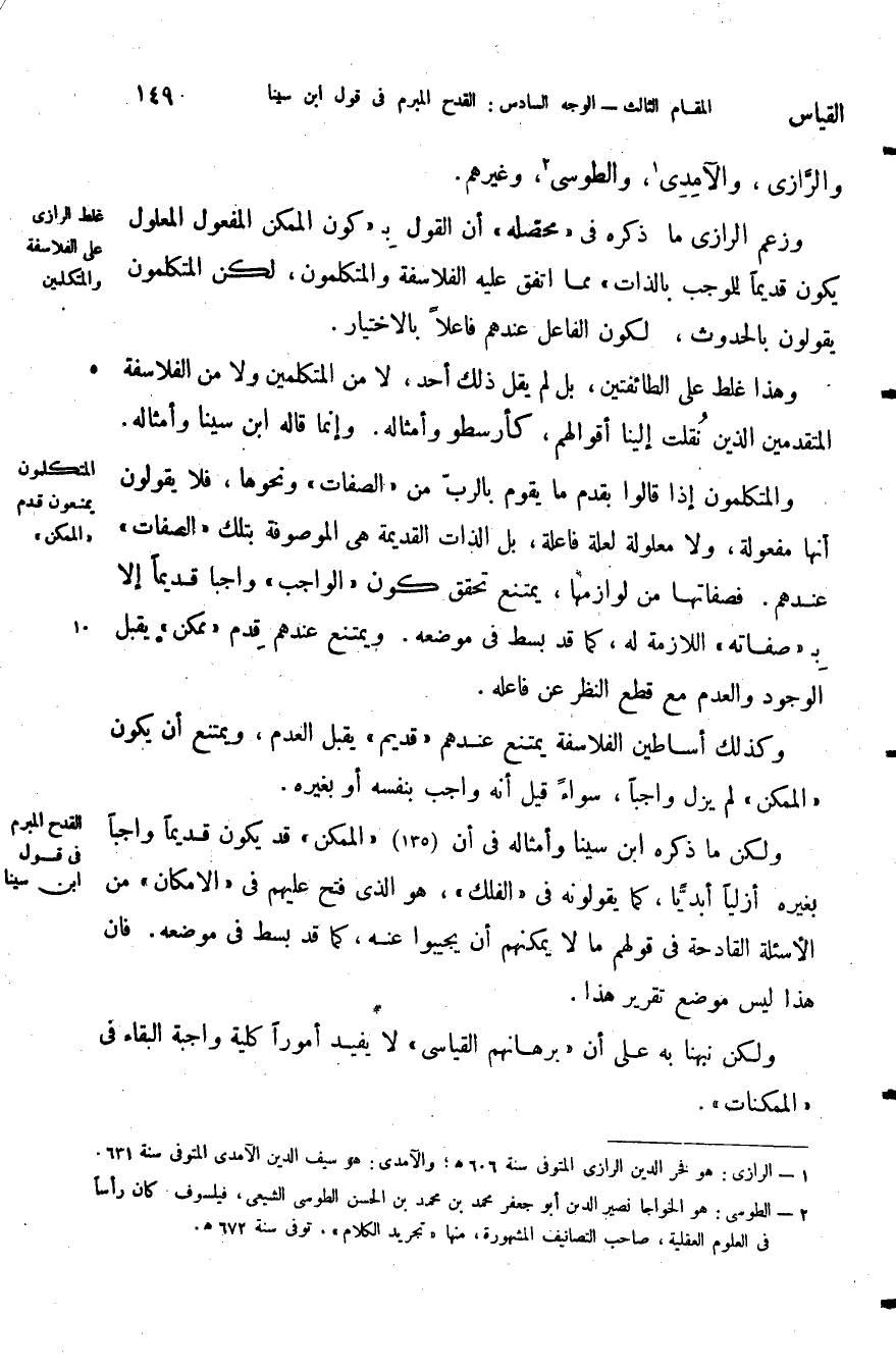 ولكن ما ذكره ابن سينا وأمثاله في أن الممكن قد يكون قديما واجبا بغيره أزليا أبديا كما يقولونه في الفلك هو الذي فتح عليهم في الإمكان من الأسئلة القادحة في قولهم ما لا يمكنهم أن يجيبوا عنه كما قد بسط في موضعه فان ليس موضع تقريره هذا ولكن نبهنا به على أن برهانهم القياسي إلي لا يفيد أمورا كلية واجبة البقاء في الممكنات