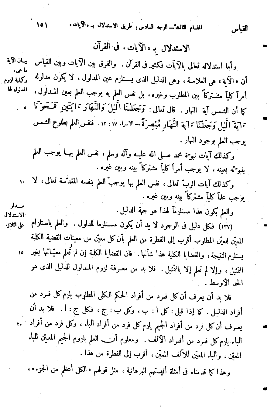 وأما استدلاله تعالى بالآيات فكثير في القران والفرق بين الآيات وبين القياس أن الآية هي العلامة وهي الدليل الذي يستلزم عين المدلول لا يكون مدلوله أمرا كليا مشتركا بين المطلوب وغيره بل نفس العلم به يوجب العلم بعين المدلول كما أن الشمس آية النهار قال تعالى: {وَجَعَلْنَا اللَّيْلَ وَالنَّهَارَ آيَتَيْنِ فَمَحَوْنَا آيَةَ اللَّيْلِ وَجَعَلْنَا آيَةَ النَّهَارِ مُبْصِرَةً} فنفس العلم بطلوع الشمس يوجب العلم بوجود النهار.