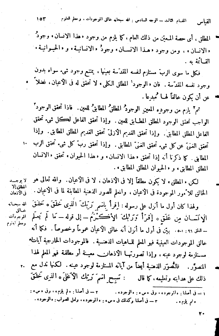 ولهذا كان أول ما انزل على رسوله {اقْرَأْ بِاسْمِ رَبِّكَ الَّذِي خَلَقَ خَلَقَ الإنسان مِنْ عَلَقٍ اقْرَأْ وَرَبُّكَ الأَكْرَمُ} إلى قوله: {مَا لَمْ يَعْلَمْ} بين في أول ما انزل أنه خالق الأعيان عموما وخصوصا فكما أنه خالق الموجودات العينية فهو المعلم للماهيات الذهنية فالموجودات الخارجية آيات مستلزمة لوجود عينه وإذا تصورتها الأذهان معينة أو مطلقة فهو المعلم لهذا المتصور إذ الصور الذهنية أيضا من آياته المستلزمة لوجود عينه لكنها تدل مع ذلك على هدايته وتعليمه كما قال تعالى: {سَبِّحِ اسْمَ رَبِّكَ الأَعْلَى الَّذِي خَلَقَ